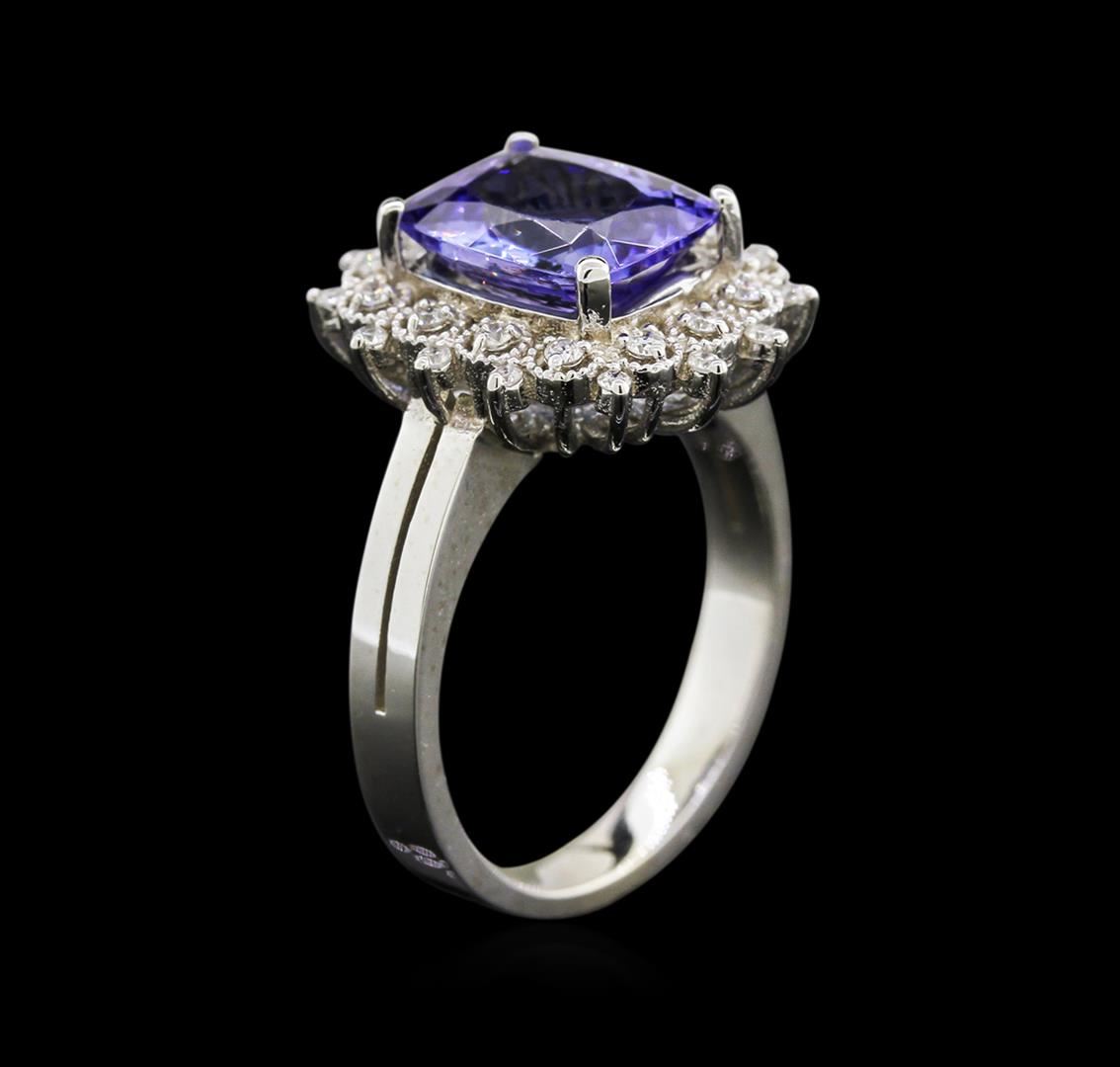 One electronically tested 14KT white gold lady's cast fashion ring with a double halo with a bright polish finish. The featured lady's ring has a 2.96 millimeter wide shank. Identified with markings of "K14". Condition is new, good workmanship. Containing: One prong set rectangular cushion modified brilliant cut natural tanzanite, measuring 10.40 x 8.05 x 4.85mm, approximate weight of 3.25ct., clarity is eye clean, type I, medium light, very slightly grayish, violetish blue color, (GIA vB 4/3), cut is good. Transmitting light with no distortion, transparent. Colored gemstones are presumed to have been subjected to commonly used enhancement processes. Graded in the setting. Twenty-Eight prong set round brilliant cut diamonds, measuring 1.40 - 1.30 x 0.88mm (depth est.) approximate total weight of 28 Stones = 0.27ct. Graded in the setting. Clarity: SI-2 to I-1. Color: H - I. Cut Good. Total Weight of Colored Stones 3.25ct. Total Weight of Diamonds 0.27ct. Total Weight of Ring 6.60gm. GAS Appraised at $5,700.00.