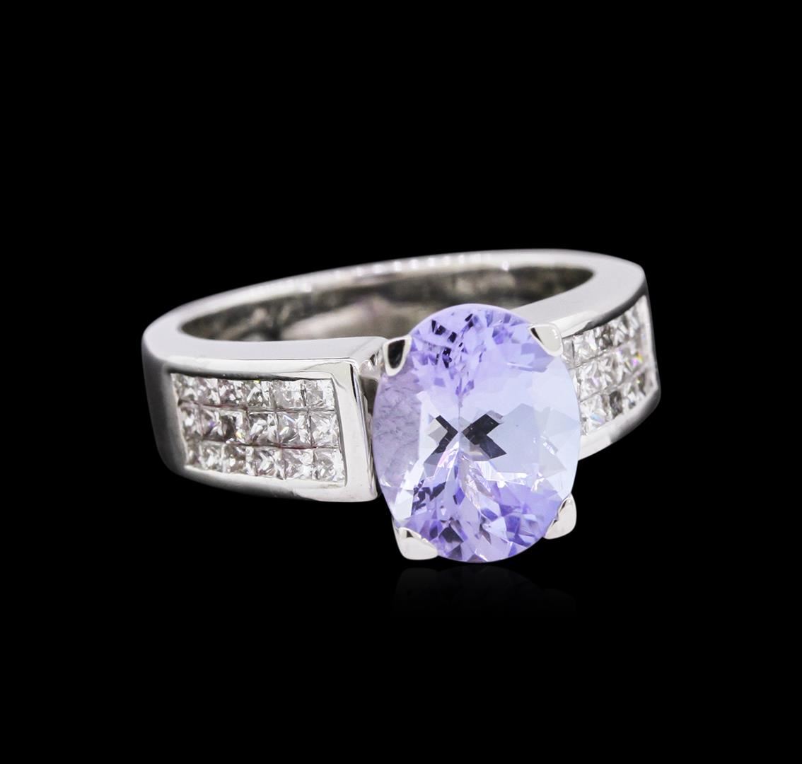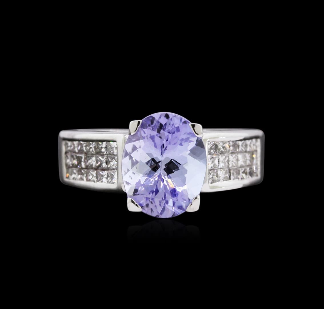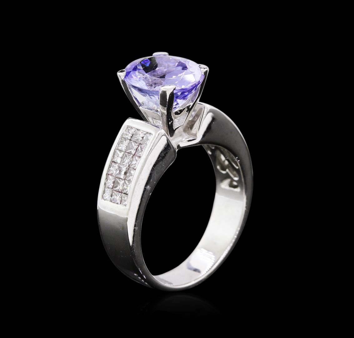One electronically tested 18KT white gold lady's combination cast & assembled fashion ring with a tapered shank with a bright polish finish. Condition is new, good workmanship. The featured lady's ring has a shank measuring 4.61 millimeters wide. Identified with markings of "18K". Containing: One prong set oval modified brilliant cut natural tanzanite, measuring 10.50 x 8.38 x 5.45mm, approximate weight of 3.25ct., clarity is eye clean, type 1, light, very slightly grayish, bluish violet color, (GIA vV 3/3), cut is good. Transmitting light with no distortion, transparent. Colored gemstones are presumed to have been subjected to commonly used enhancement processes. Graded in the setting. Thirty-six invisible set princess cut diamonds, measuring 1.50 x 1.45 x 1.16mm (depth est.) approximate total weight of 36 Stones = 0.75ct. Graded in setting. Clarity: SI-1 to I-1. Color: H - I. Cut: Very Good. Total Weight of Colored Stones: 3.25ct. Total Weight of Diamonds: 0.75ct. Total Weight of Ring: 8.20gm. GAS Appraised at $5,770.00.