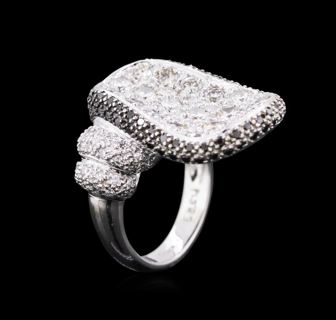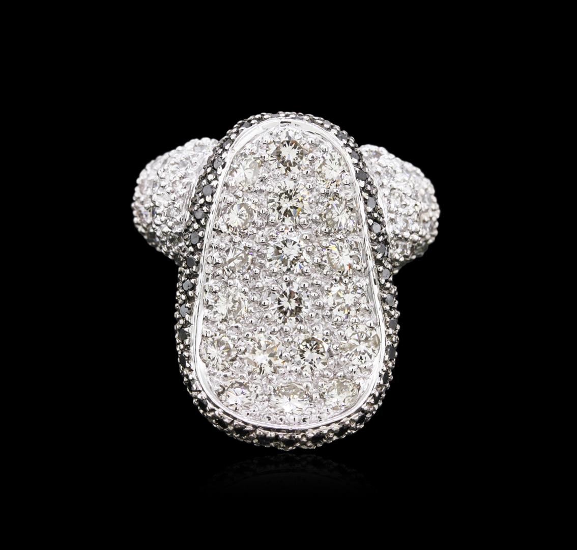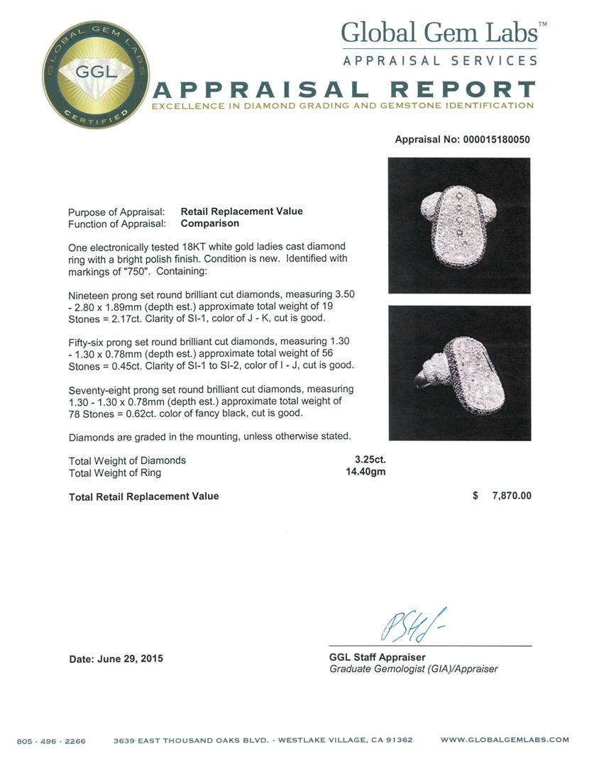 One electronically tested 18KT white gold ladies cast diamond ring with a bright polish finish. Identified with markings of "750". Condition is new. Containing: Nineteen prong set round brilliant cut diamonds, measuring 3.50 - 2.80 x 1.89mm (depth est.) approximate. Total Weight of 19 Stones = 2.17ct. Clarity: SI-1. Color: J - K, Cut is Good. Fifty-Six prong set round brilliant cut diamonds, measuring 1.30 - 1.30 x 0.78mm (depth est.) approximate. Total Weight of 56 Stones = 0.45ct. Clarity: SI-1 to SI-2. Color: I - J, Cut is Good. Seventy-Eight prong set round brilliant cut diamonds, measuring 1.30 - 1.30 x 0.78mm (depth est.) approximate. Total Weight of 78 Stones = 0.62ct. Cut is Good. Diamonds are graded in the mounting, unless otherwise stated. Total Weight of Diamonds 3.25ct. Total Weight of Ring 14.40 grams. GGL Appraised at $7,870.00.