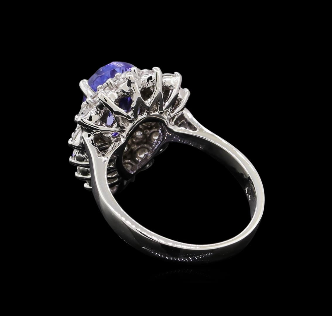 One electronically tested 14KT white gold lady's cast fashion ring with a double basket halo with a bright polish finish. The featured lady's ring has a shank measuring 3.0 millimeters in width. Identified with markings of 'K14'. Condition is new, good workmanship. Containing: One prong set pear modified brilliant cut natural tanzanite, measuring 11.65 x 7.60 x 5.41mm, (depth est.) approximate weight of 3.27ct., clarity is eye clean, medium, moderately strong, bluish violet color, (GIA bV 5/4), cut is very good. Transmitting light with no distortion, transparent. Colored gemstones are presumed to have been subjected to commonly used enhancement processes. Graded in the setting. Fourteen prong set round brilliant cut diamonds, measuring 2.10 - 2.00 x 1.23mm (depth est.) approximate total weight of 14 Stones = 0.45ct. Graded in the setting. Clarity SI-1 to SI-2. Color: H - I Cut Good Fifteen prong set round brilliant cut diamonds, measuring 2.35 - 2.30 x 1.45mm (depth est.) approximate total weight of 15 Stones = 0.72ct. Graded in the setting. Clarity SI-1 to I-1. Color: H - I Cut Good. Total Weight of Colored Stones 3.27ct.. Total Weight of Diamonds 1.17ct.. Total Weight of Ring 6.70gm. GAS Appraised at $8,615.00.