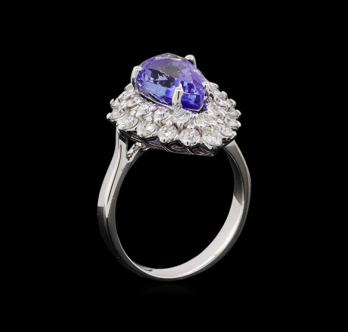 One electronically tested 14KT white gold lady's cast fashion ring with a double basket halo with a bright polish finish. The featured lady's ring has a shank measuring 3.0 millimeters in width. Identified with markings of 'K14'. Condition is new, good workmanship. Containing: One prong set pear modified brilliant cut natural tanzanite, measuring 11.65 x 7.60 x 5.41mm, (depth est.) approximate weight of 3.27ct., clarity is eye clean, medium, moderately strong, bluish violet color, (GIA bV 5/4), cut is very good. Transmitting light with no distortion, transparent. Colored gemstones are presumed to have been subjected to commonly used enhancement processes. Graded in the setting. Fourteen prong set round brilliant cut diamonds, measuring 2.10 - 2.00 x 1.23mm (depth est.) approximate total weight of 14 Stones = 0.45ct. Graded in the setting. Clarity SI-1 to SI-2. Color: H - I Cut Good Fifteen prong set round brilliant cut diamonds, measuring 2.35 - 2.30 x 1.45mm (depth est.) approximate total weight of 15 Stones = 0.72ct. Graded in the setting. Clarity SI-1 to I-1. Color: H - I Cut Good. Total Weight of Colored Stones 3.27ct.. Total Weight of Diamonds 1.17ct.. Total Weight of Ring 6.70gm. GAS Appraised at $8,615.00.