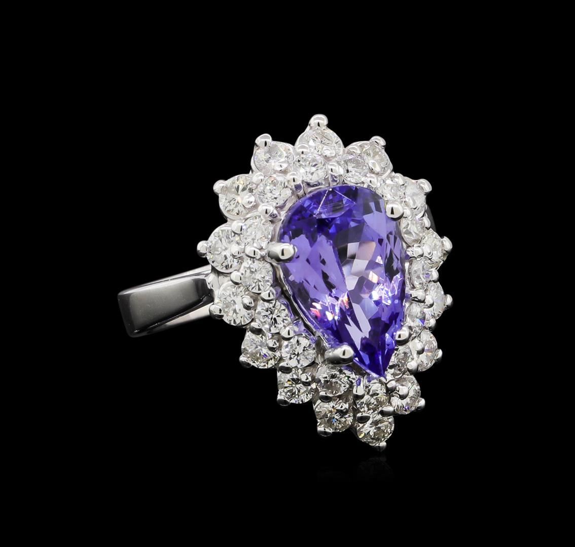 One electronically tested 14KT white gold lady's cast fashion ring with a double basket halo with a bright polish finish. The featured lady's ring has a shank measuring 3.0 millimeters in width. Identified with markings of 'K14'. Condition is new, good workmanship. Containing: One prong set pear modified brilliant cut natural tanzanite, measuring 11.65 x 7.60 x 5.41mm, (depth est.) approximate weight of 3.27ct., clarity is eye clean, medium, moderately strong, bluish violet color, (GIA bV 5/4), cut is very good. Transmitting light with no distortion, transparent. Colored gemstones are presumed to have been subjected to commonly used enhancement processes. Graded in the setting. Fourteen prong set round brilliant cut diamonds, measuring 2.10 - 2.00 x 1.23mm (depth est.) approximate total weight of 14 Stones = 0.45ct. Graded in the setting. Clarity SI-1 to SI-2. Color: H - I Cut Good Fifteen prong set round brilliant cut diamonds, measuring 2.35 - 2.30 x 1.45mm (depth est.) approximate total weight of 15 Stones = 0.72ct. Graded in the setting. Clarity SI-1 to I-1. Color: H - I Cut Good. Total Weight of Colored Stones 3.27ct.. Total Weight of Diamonds 1.17ct.. Total Weight of Ring 6.70gm. GAS Appraised.