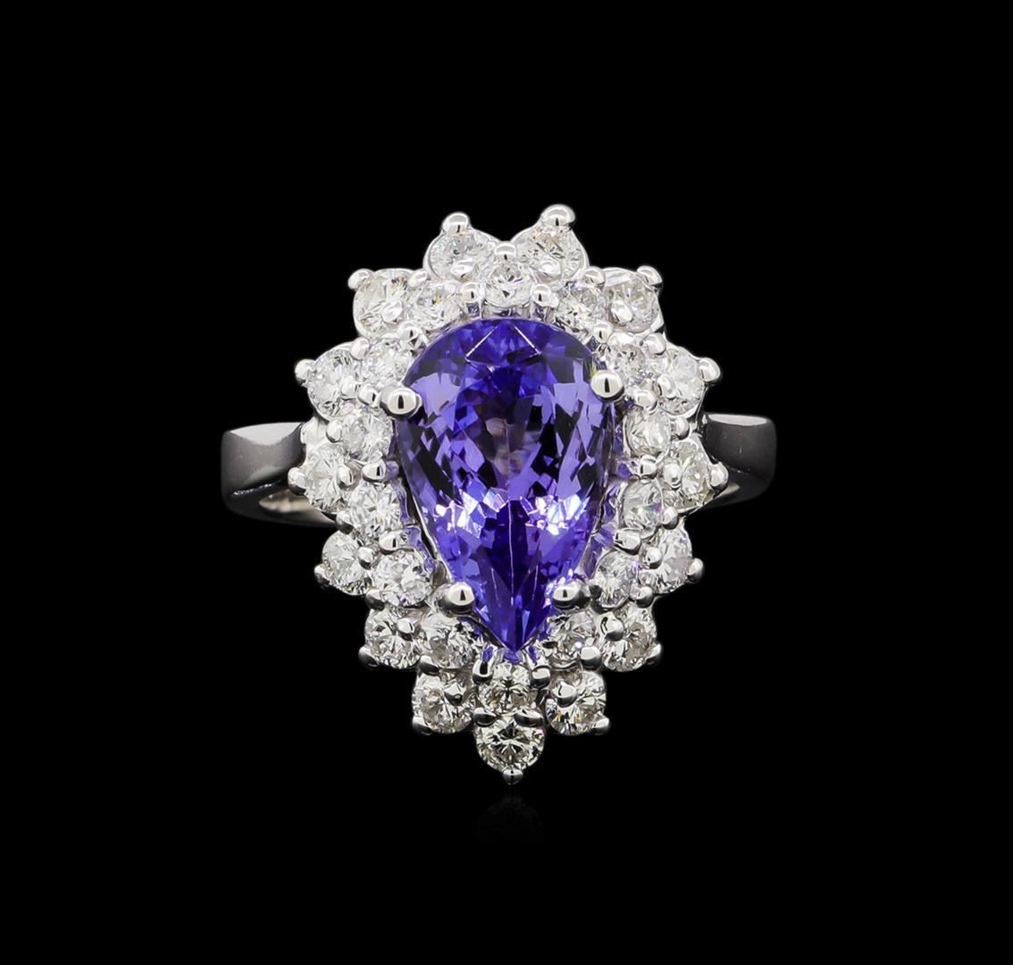 One electronically tested 14KT white gold lady's cast fashion ring with a double basket halo with a bright polish finish. The featured lady's ring has a shank measuring 3.0 millimeters in width. Identified with markings of 'K14'. Condition is new, good workmanship. Containing: One prong set pear modified brilliant cut natural tanzanite, measuring 11.65 x 7.60 x 5.41mm, (depth est.) approximate weight of 3.27ct., clarity is eye clean, medium, moderately strong, bluish violet color, (GIA bV 5/4), cut is very good. Transmitting light with no distortion, transparent. Colored gemstones are presumed to have been subjected to commonly used enhancement processes. Graded in the setting. Fourteen prong set round brilliant cut diamonds, measuring 2.10 - 2.00 x 1.23mm (depth est.) approximate total weight of 14 Stones = 0.45ct. Graded in the setting. Clarity SI-1 to SI-2. Color: H - I Cut Good Fifteen prong set round brilliant cut diamonds, measuring 2.35 - 2.30 x 1.45mm (depth est.) approximate total weight of 15 Stones = 0.72ct. Graded in the setting. Clarity SI-1 to I-1. Color: H - I Cut Good. Total Weight of Colored Stones 3.27ct.. Total Weight of Diamonds 1.17ct.. Total Weight of Ring 6.70gm. GAS Appraised.