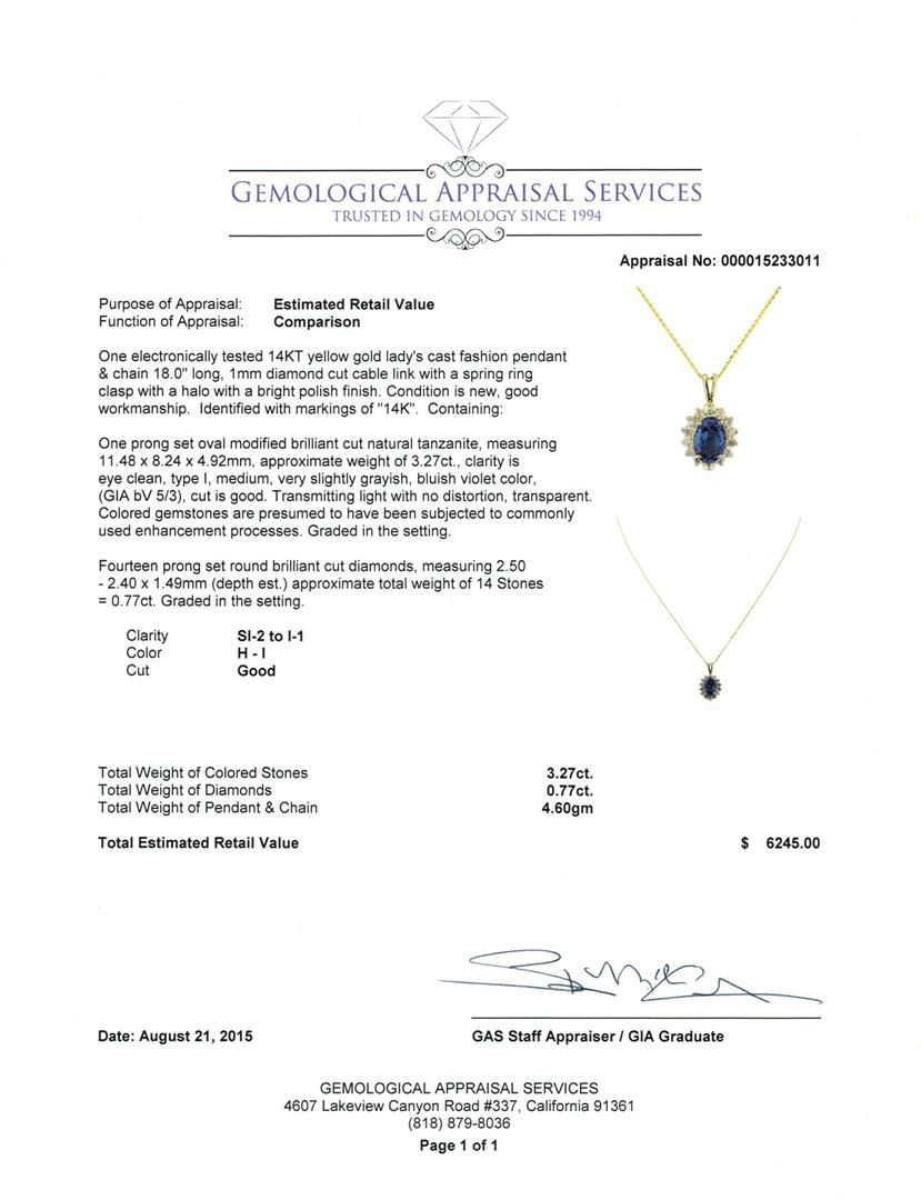 One electronically tested 14KT yellow gold lady's cast fashion pendant & chain 18.0" long, 1mm diamond cut cable link with a spring ring clasp with a halo with a bright polish finish. Identified with markings of "14K". Condition is new, good workmanship. Containing: One prong set oval modified brilliant cut natural tanzanite, measuring 11.48 x 8.24 x 4.92mm, approximate weight of 3.27ct., clarity is eye clean, type I, medium, very slightly grayish, bluish violet color, (GIA bV 5/3), cut is good. Transmitting light with no distortion, transparent. Colored gemstones are presumed to have been subjected to commonly used enhancement processes. Graded in the setting. Fourteen prong set round brilliant cut diamonds, measuring 2.50 - 2.40 x 1.49mm (depth est.) approximate total weight of 14 Stones = 0.77ct. Graded in the setting. Clarity: SI-2 to I-1. Color: H - I. Cut Good. Total Weight of Colored Stones 3.27ct. Total Weight of Diamonds 0.77ct. Total Weight of Pendant & Chain 4.60gm. GAS Appraised at $6,245.00.