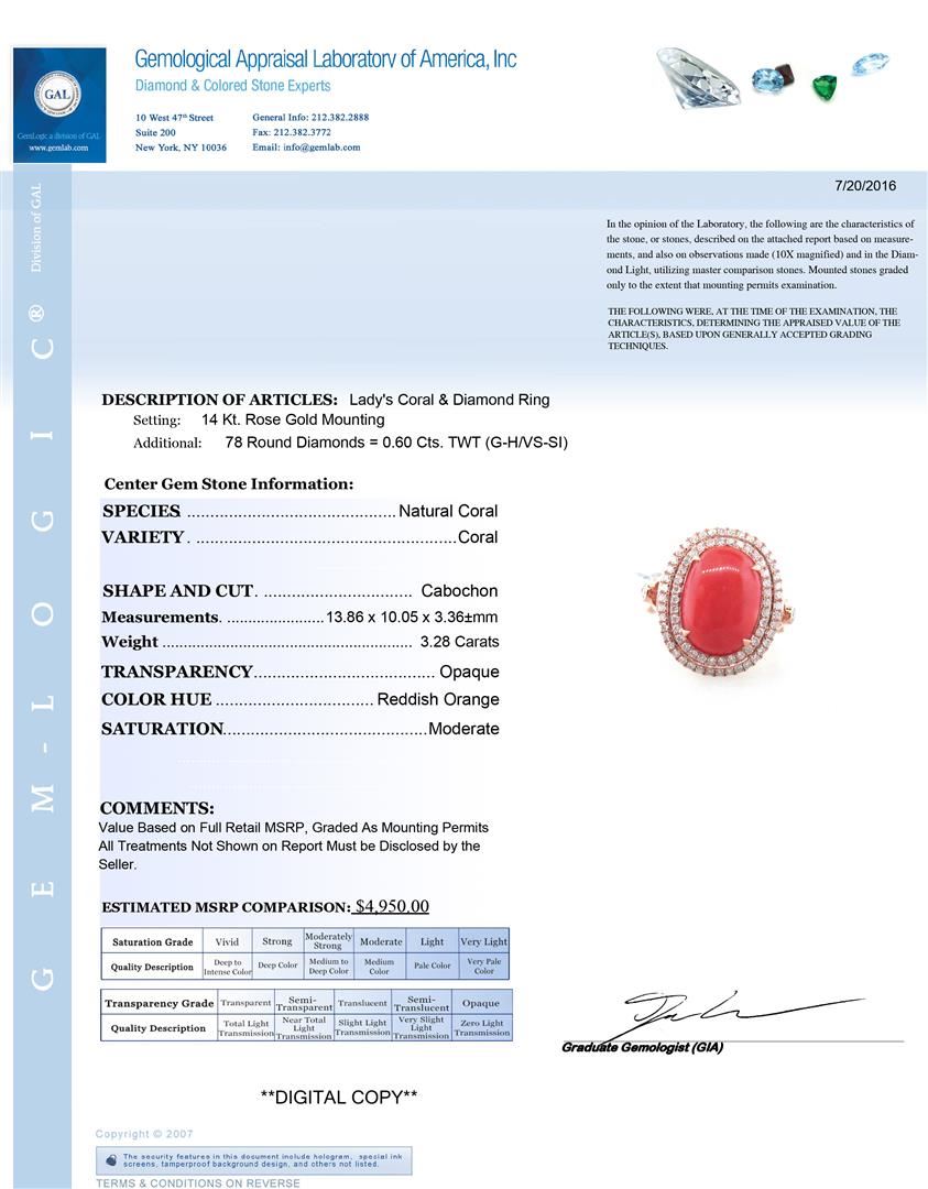 One Lady's Coral and Diamond Ring. Setting: 14 Kt. Rose Gold Mounting. Additional: 78 Round Diamonds = 0.60 Cts. TWT (G-H/VS-SI). Center Gem Stone Information: Species: Natural Coral. Variety: Coral. Shape and Cut: Cabochon. Measurements: 13.86 x 10.05 x 3.36 mm. Weight: 3.28 Carats. Transparency: Opaque. Color Hue: Reddish Orange. Saturation: Moderate. Total Weight: 5.55 grams.