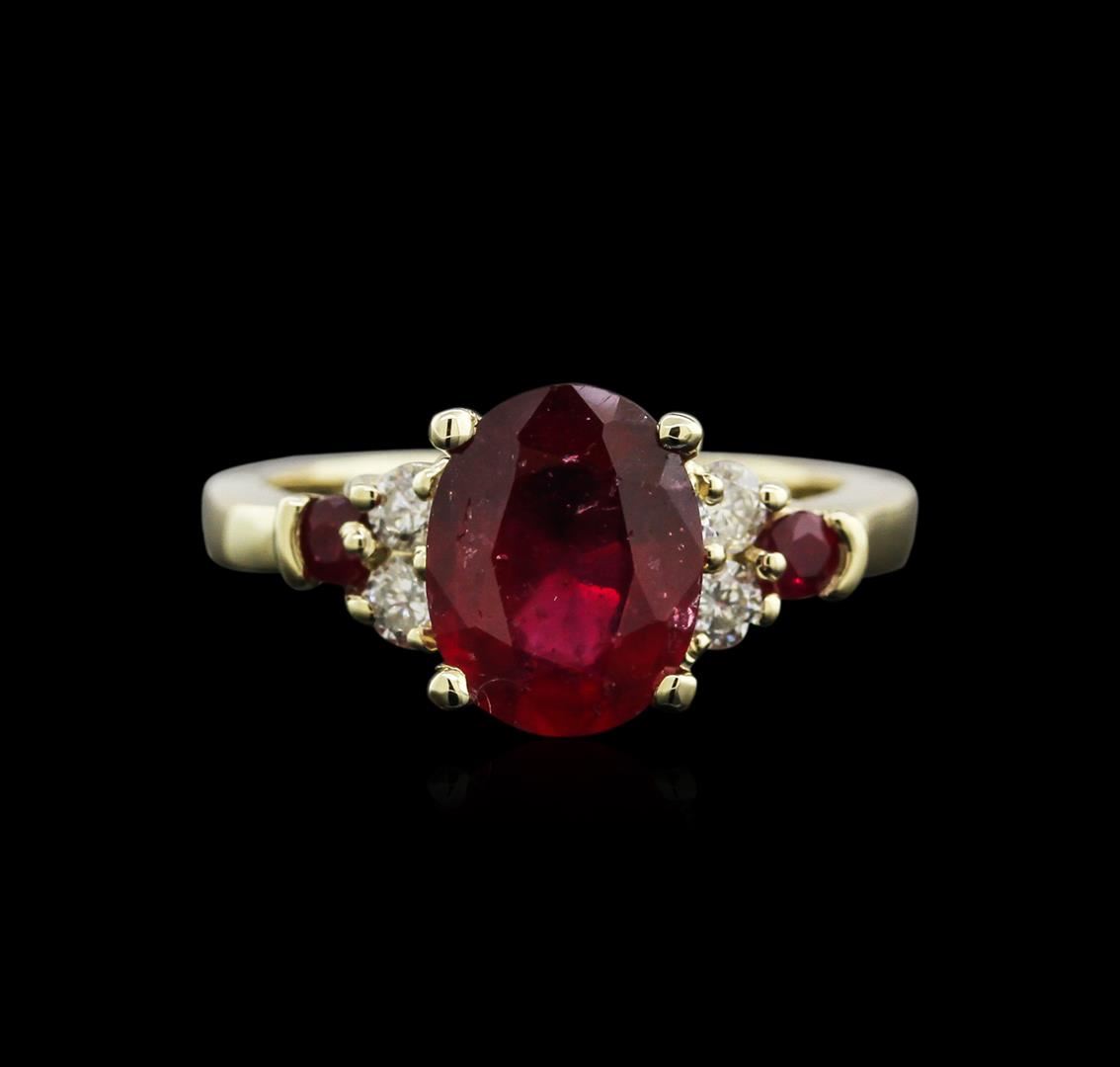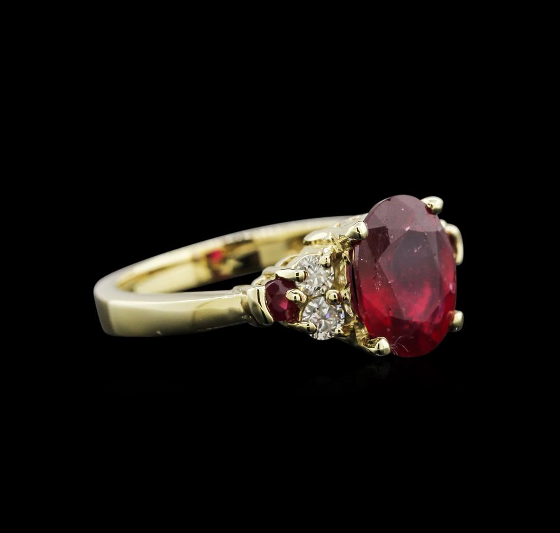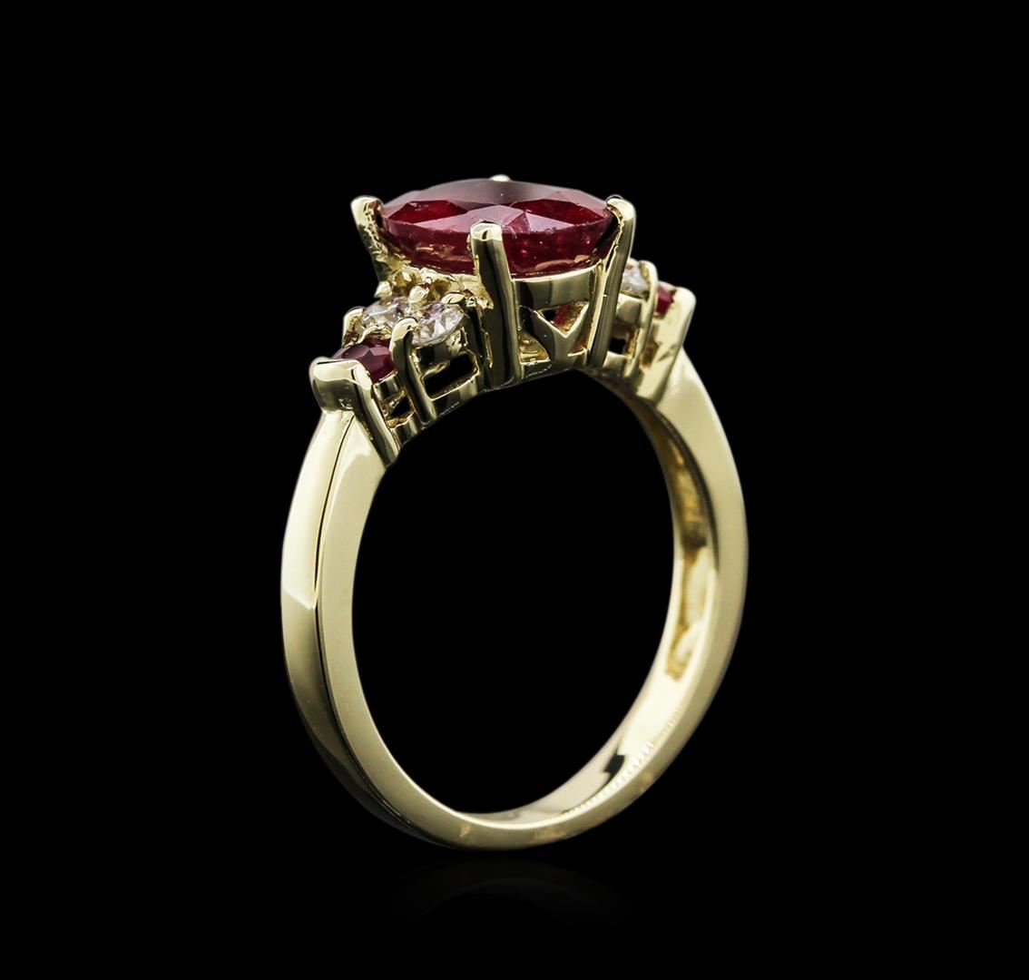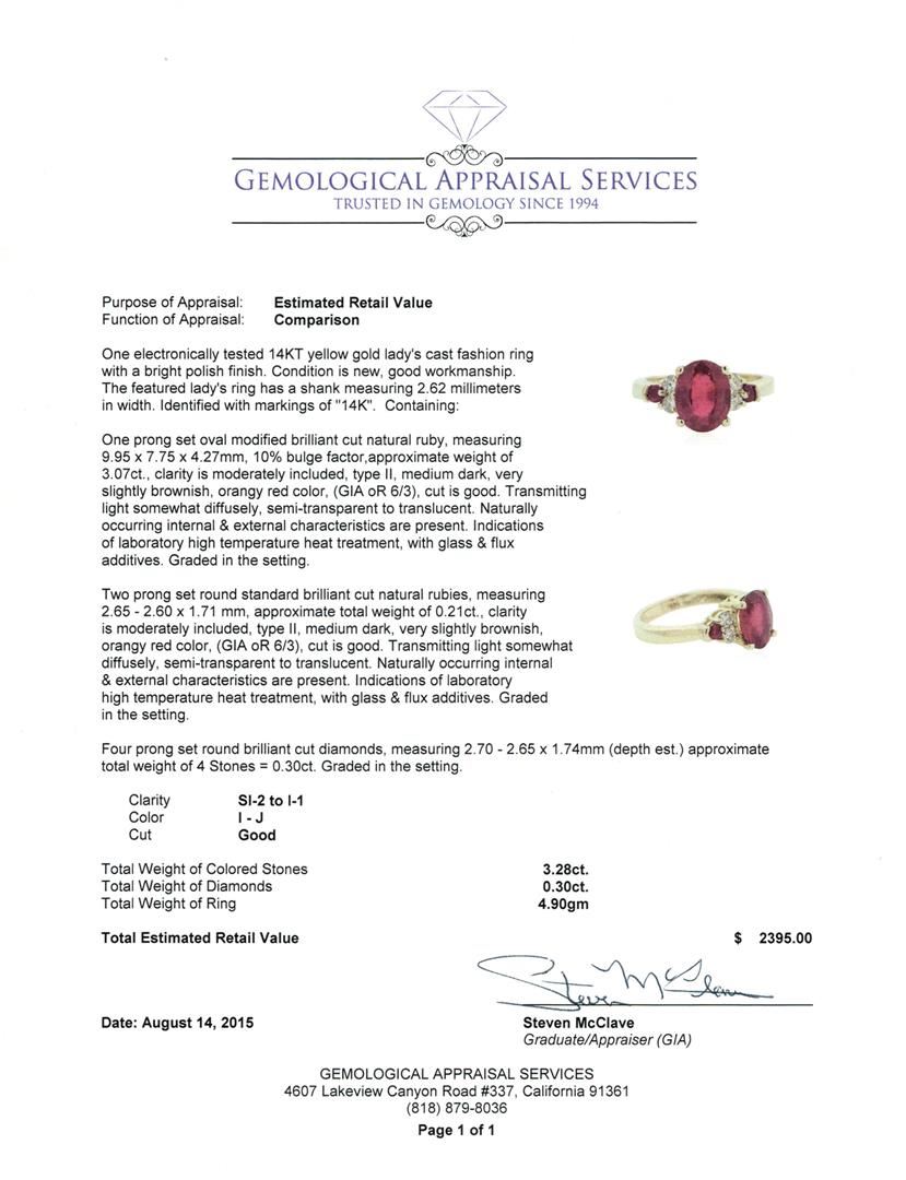 One electronically tested 14KT yellow gold lady's cast fashion ring with a bright polish finish. The featured lady's ring has a shank measuring 2.62 millimeters in width. Identified with markings of "14K". Condition is new, good workmanship. Containing: One prong set oval modified brilliant cut natural ruby, measuring 9.95 x 7.75 x 4.27mm, 10% bulge factor, approximate weight of 3.07ct., clarity is moderately included, type II, medium dark, very slightly brownish, orangy red color, (GIA oR 6/3), cut is good. Transmitting light somewhat diffusely, semi-transparent to translucent. Naturally occurring internal & external characteristics are present. Indications of laboratory high temperature heat treatment, with glass & flux additives. Graded in the setting. Two prong set round standard brilliant cut natural rubies, measuring 2.65 - 2.60 x 1.71 mm, approximate total weight of 0.21ct., clarity is moderately included, type II, medium dark, very slightly brownish, orangy red color, (GIA oR 6/3), cut is good. Transmitting light somewhat diffusely, semi-transparent to translucent. Naturally occurring internal & external characteristics are present. Indications of laboratory high temperature heat treatment, with glass & flux additives. Graded in the setting. Four prong set round brilliant cut diamonds, measuring 2.70 - 2.65 x 1.74mm (depth est.) approximate total weight of 4 Stones = 0.30ct. Graded in the setting. Clarity: SI-2 to I-1. Color: I - J. Cut Good. Total Weight of Colored Stones 3.28ct. Total Weight of Diamonds 0.30ct. Total Weight of Ring 4.90gm. GAS Appraised at $2,395.00.
