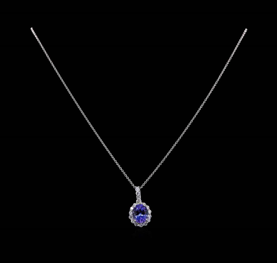 One electronically tested 14KT white gold lady's combination cast & assembled solitaire drop pendant & chain 18.0' long, 1.3mm oval cable link with a lobster claw clasp with a oval halo with a bright polish finish. Identified with markings of '14K 585'. Condition is new, good workmanship. Containing: One prong set oval modified brilliant cut natural tanzanite, measuring 10.45 x 8.52 x 5.68mm, (depth est.) approximate weight of 3.28ct., clarity is eye clean, medium, very slightly grayish, bluish violet color, (GIA bV 5/3), cut is very good. Transmitting light with no distortion, transparent. Colored gemstones are presumed to have been subjected to commonly used enhancement processes. Graded in the setting. Fifteen prong set round brilliant cut diamonds, measuring 2.10 - 2.05 x 1.29mm (depth est.) approximate total weight of 15 Stones = 0.52ct. Graded in the setting. Clarity VS-2 to SI-2. Color: H - I Cut Good Three prong set round brilliant cut diamonds, measuring 2.00 - 1.60 x 1.12mm (depth est.) approximate total weight of 3 Stones = 0.08ct. Graded in the setting. Clarity SI-1 to SI-2. Color: H - I Cut Good. Total Weight of Colored Stones 3.28ct.. Total Weight of Diamonds 0.60ct.. Total Weight of Pendant & Chain 5.00gm. GAS Appraised at $7,145.00.