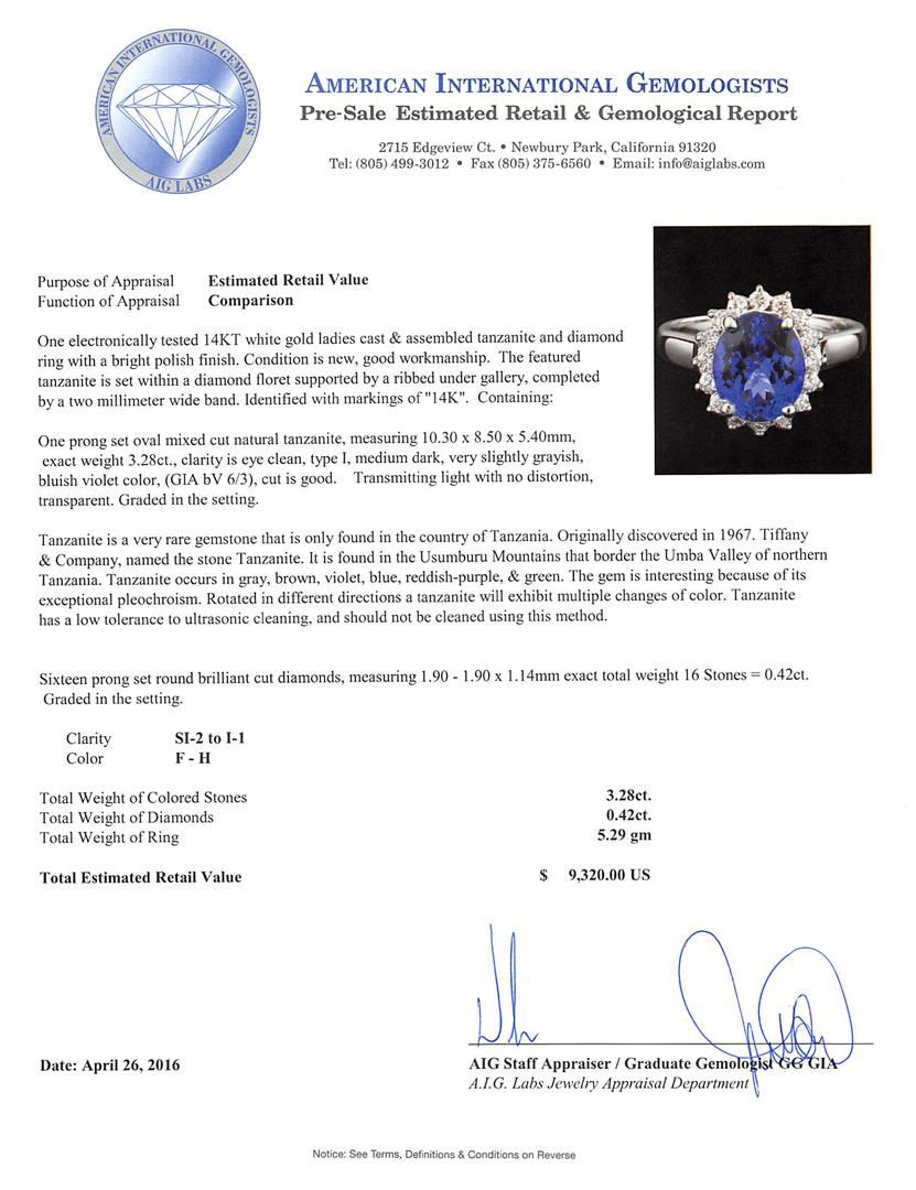 One electronically tested 14KT white gold ladies cast & assembled tanzanite and diamond ring with a bright polish finish. The featured tanzanite is set within a diamond floret supported by a ribbed under gallery, completed by a two millimeter wide band. Identified with markings of "14K". Condition is new, good workmanship. Containing: One prong set oval mixed cut natural tanzanite, measuring 10.30 x 8.50 x 5.40mm, exact weight 3.28ct., clarity is eye clean, type I, medium dark, very slightly grayish, bluish violet color, (GIA bV 6/3), cut is good. Transmitting light with no distortion, transparent. Graded in the setting. Tanzanite is a very rare gemstone that is only found in the country of Tanzania. Originally discovered in 1967. Tiffany & Company, named the stone Tanzanite. It is found in the Usumburu Mountains that border the Umba Valley of northern Tanzania. Tanzanite occurs in gray, brown, violet, blue, reddish-purple, & green. The gem is interesting because of its exceptional pleochroism. Rotated in different directions a tanzanite will exhibit multiple changes of color. Tanzanite has a low tolerance to ultrasonic cleaning, and should not be cleaned using this method. Sixteen prong set round brilliant cut diamonds, measuring 1.90 - 1.90 x 1.14mm exact total weight 16 Stones = 0.42ct. Graded in the setting. Clarity: SI-2 to I-1. Color: F - H. Total Weight of Colored Stones 3.28ct. Total Weight of Diamonds 0.42ct. Total Weight of Ring 5.29gm. AIG Appraised at $9,320.00.