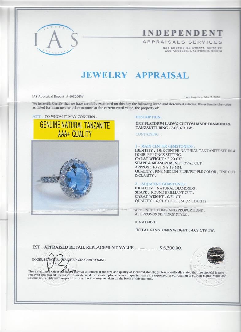 One 3.29ct Tanzanite and Diamond Ring - Platinum. IAS certified. See Appraisal for more details.