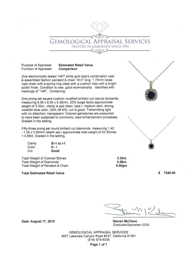 One electronically tested 14KT white gold lady's combination cast & assembled fashion pendant & chain 18.0" long, 1.75mm loose rope chain with a spring ring clasp with a cushion halo with a bright polish finish. Identified with markings of "14K". Condition is new, good workmanship. Containing: One prong set square cushion modified brilliant cut natural tanzanite, measuring 8.08 x 8.05 x 5.36mm, 20% bulge factor, approximate weight of 3.30ct., clarity is eye clean, type I, medium dark, strong, violetish blue color, (GIA vB 6/5), cut is good. Transmitting light with no distortion, transparent. Colored gemstones are presumed to have been subjected to commonly used enhancement processes. Graded in the setting. Fifty-Three prong set round brilliant cut diamonds, measuring 1.40 - 1.35 x 0.90mm (depth est.) approximate total weight of 53 Stones = 0.58ct. Graded in the setting. Clarity: SI-1 to I-1. Color: H - I. Cut Good. Total Weight of Colored Stones 3.30ct. Total Weight of Diamonds 0.58ct. Total Weight of Pendant & Chain 6.50gm. GAS Appraised at $7,340.00.