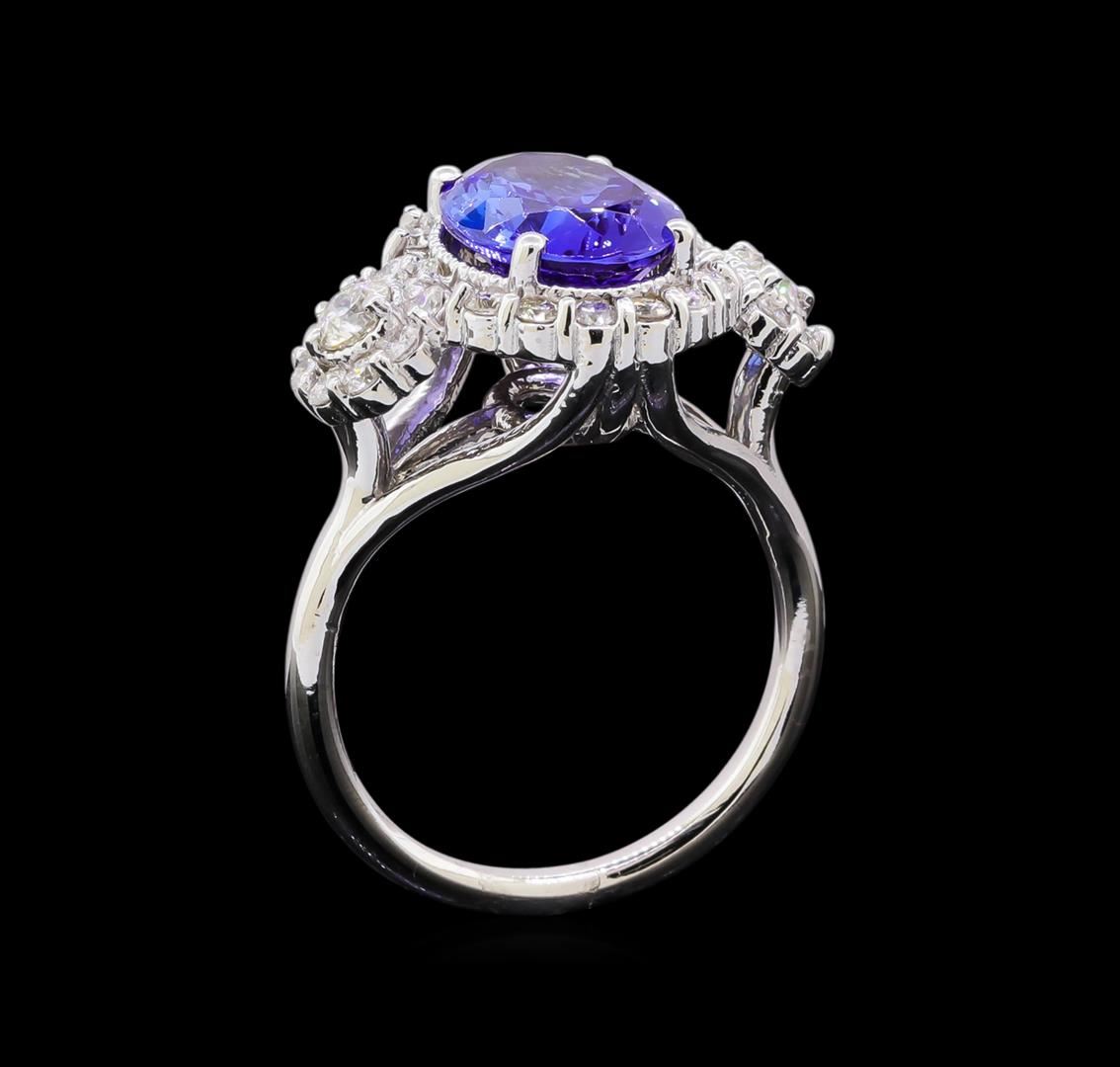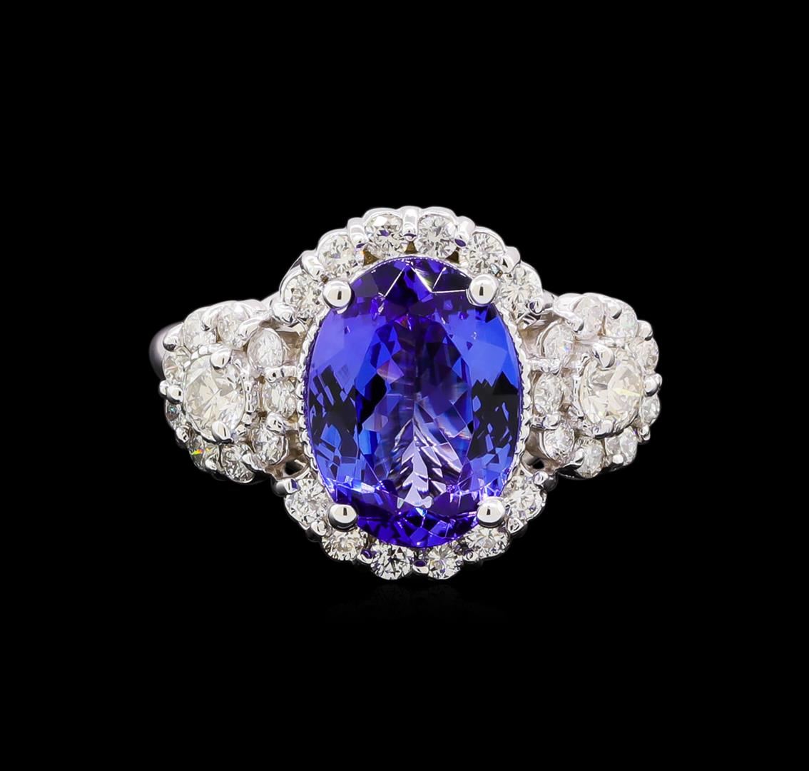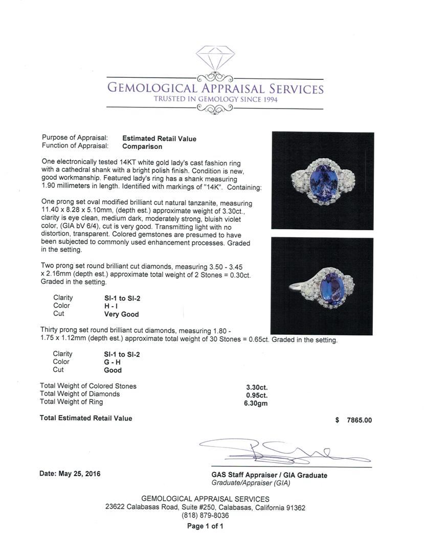 One electronically tested 14KT white gold lady's cast fashion ring with a cathedral shank with a bright polish finish. Featured lady's ring has a shank measuring 1.90 millimeters in length. Identified with markings of "14K". Condition is new, good workmanship. Containing: One prong set oval modified brilliant cut natural tanzanite, measuring 11.40 x 8.28 x 5.10mm, (depth est.) approximate weight of 3.30ct., clarity is eye clean, medium dark, moderately strong, bluish violet color, (GIA bV 6/4), cut is very good. Transmitting light with no distortion, transparent. Colored gemstones are presumed to have been subjected to commonly used enhancement processes. Graded in the setting. Two prong set round brilliant cut diamonds, measuring 3.50 - 3.45 x 2.16mm (depth est.) approximate total weight of 2 Stones = 0.30ct. Graded in the setting. Clarity: SI-1 to SI-2. Color: H - I. Cut Very Good Thirty prong set round brilliant cut diamonds, measuring 1.80 - 1.75 x 1.12mm (depth est.) approximate total weight of 30 Stones = 0.65ct. Graded in the setting. Clarity: SI-1 to SI-2. Color: G - Good. Total Weight of Colored Stones 3.30ct. Total Weight of Diamonds 0.95ct. Total Weight of Ring 6.30gm. GAS Appraised at $7,865.00.