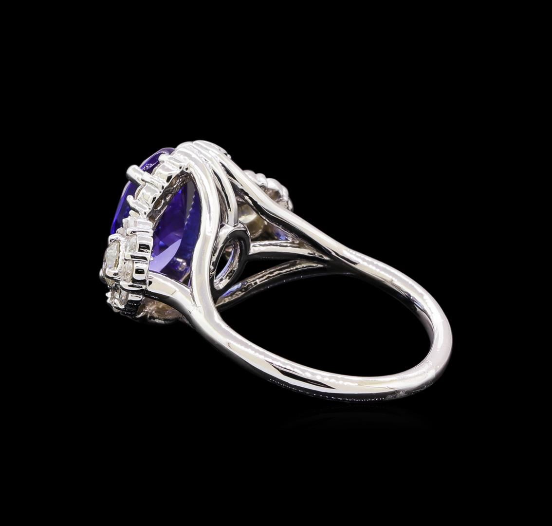 One electronically tested 14KT white gold lady's cast fashion ring with a cathedral shank with a bright polish finish. Featured lady's ring has a shank measuring 1.90 millimeters in length. Identified with markings of "14K". Condition is new, good workmanship. Containing: One prong set oval modified brilliant cut natural tanzanite, measuring 11.40 x 8.28 x 5.10mm, (depth est.) approximate weight of 3.30ct., clarity is eye clean, medium dark, moderately strong, bluish violet color, (GIA bV 6/4), cut is very good. Transmitting light with no distortion, transparent. Colored gemstones are presumed to have been subjected to commonly used enhancement processes. Graded in the setting. Two prong set round brilliant cut diamonds, measuring 3.50 - 3.45 x 2.16mm (depth est.) approximate total weight of 2 Stones = 0.30ct. Graded in the setting. Clarity: SI-1 to SI-2. Color: H - I. Cut Very Good Thirty prong set round brilliant cut diamonds, measuring 1.80 - 1.75 x 1.12mm (depth est.) approximate total weight of 30 Stones = 0.65ct. Graded in the setting. Clarity: SI-1 to SI-2. Color: G - Good. Total Weight of Colored Stones 3.30ct. Total Weight of Diamonds 0.95ct. Total Weight of Ring 6.30gm. GAS Appraised at $7,865.00.