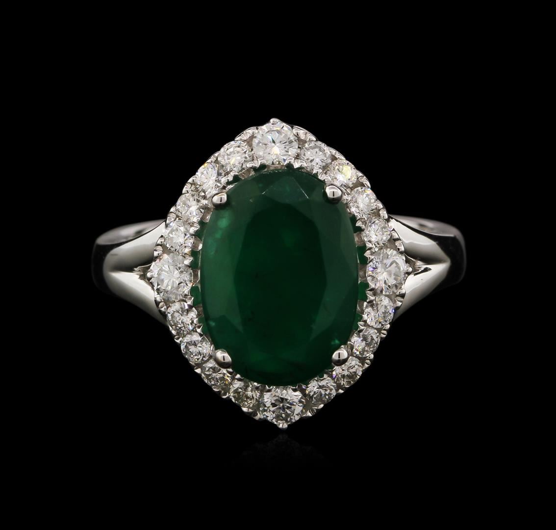 One electronically tested 18KT white gold ladies cast emerald and diamond ring with a bright polish finish. Identified with markings of "18K". Condition is new. Containing: One prong set oval modified brilliant cut natural emerald, measuring 12.00 x 8.60 x 5.59mm, approximate weight of 3.30ct., clarity is moderately included, type III, medium, moderately strong, green color, (GIA G 5/4), cut is good. Twenty prong set round brilliant cut diamonds, measuring 2.50 - 2.00 x 1.35mm (depth est.) approximate total weight of 20 Stones = 0.63ct. Clarity: SI-1 to SI-2. Color: H - I, Cut is Good. Diamonds are graded in the mounting, unless otherwise stated. Total Weight of Colored Stones 3.30ct. Total Weight of Diamonds 0.63ct. Total Weight of Ring 6.80 grams. GGL Appraised at $4,285.00.