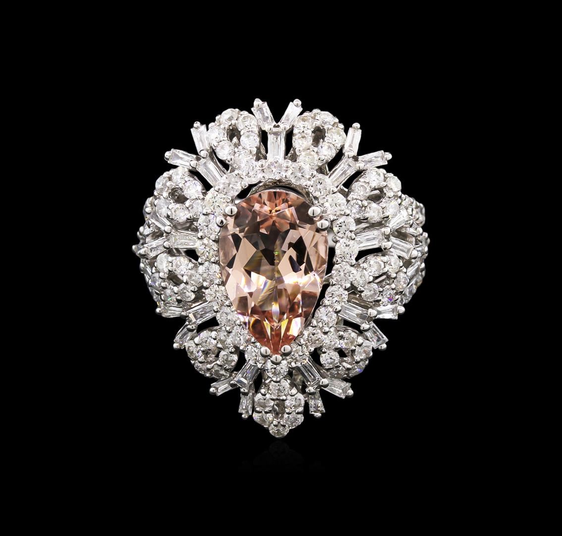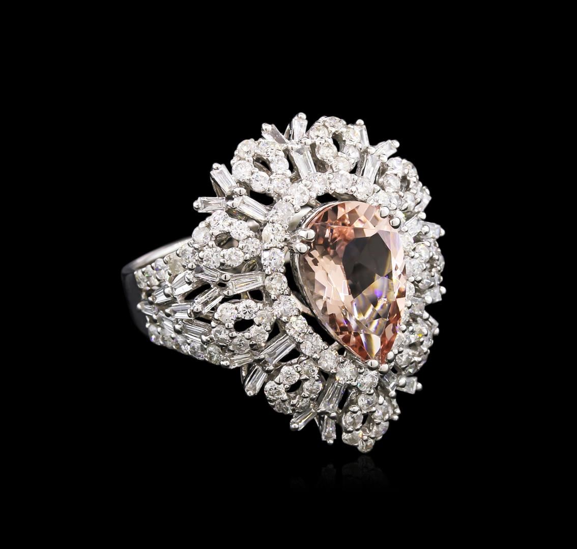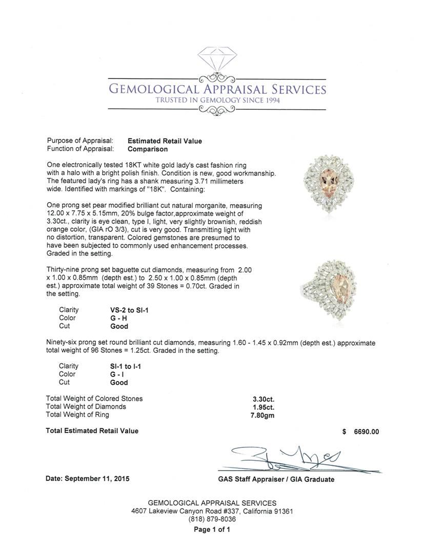 One electronically tested 18KT white gold lady's cast fashion ring with a halo with a bright polish finish. The featured lady's ring has a shank measuring 3.71 millimeters wide. Identified with markings of "18K". Condition is new, good workmanship. Containing: One prong set pear modified brilliant cut natural morganite, measuring 12.00 x 7.75 x 5.15mm, 20% bulge factor, approximate weight of 3.30ct., clarity is eye clean, type I, light, very slightly brownish, reddish orange color, (GIA rO 3/3), cut is very good. Transmitting light with no distortion, transparent. Colored gemstones are presumed to have been subjected to commonly used enhancement processes. Graded in the setting. Thirty-Nine prong set baguette cut diamonds, measuring from 2.00 x 1.00 x 0.85mm (depth est.) to 2.50 x 1.00 x 0.85mm (depth est.) approximate total weight of 39 Stones = 0.70ct. Graded in the setting. Clarity: VS-2 to SI-1. Color: G - Good Ninety-Six prong set round brilliant cut diamonds, measuring 1.60 - 1.45 x 0.92mm (depth est.) approximate total weight of 96 Stones = 1.25ct. Graded in the setting. Clarity: SI-1 to I-1. Color: G - I. Cut Good. Total Weight of Colored Stones 3.30ct. Total Weight of Diamonds 1.95ct. Total Weight of Ring 7.80gm. GAS Appraised at $6,690.00.