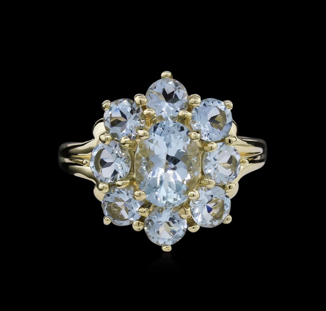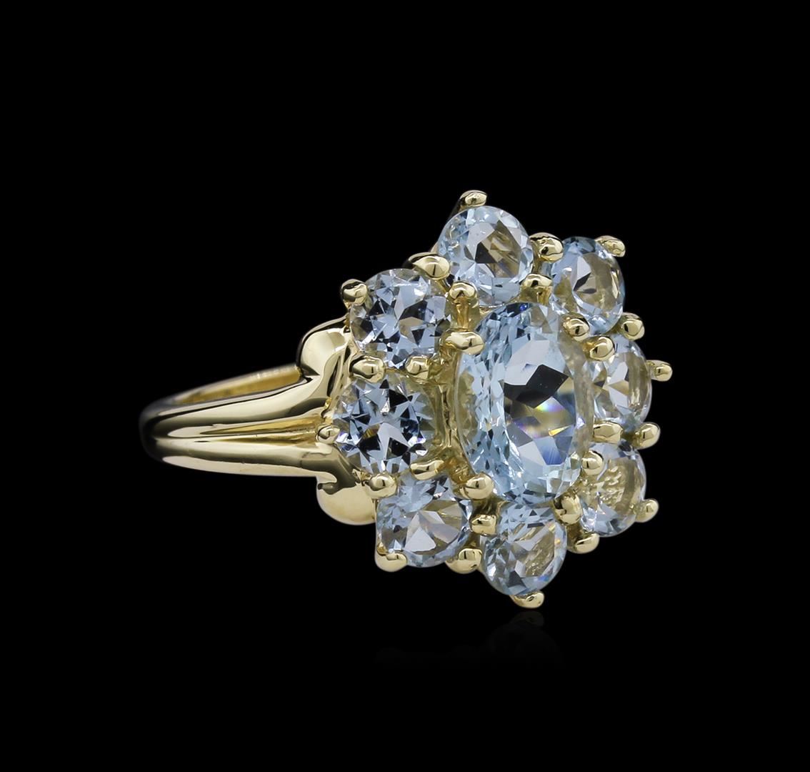 One electronically tested 10KT yellow gold lady's cast cocktail ring with a tapered shank with a bright polish finish. The featured lady's ring has a shank measuring 1.78 millimeters wide. Identified with markings of "10K". Condition is new, good workmanship. Containing: One prong set oval modified brilliant cut natural aquamarine, measuring 8.11 x 6.10 x 4.34mm, approximate weight of 1.25ct., clarity is eye clean, type I, light, very slightly grayish, blue color, (GIA B 3/3), cut is very good. Colored gemstones are presumed to have been subjected to commonly used enhancement processes. Graded in the setting. Eight prong set round modified brilliant cut natural aquamarines, measuring 4.20 - 4.10 x 2.70 mm, approximate total weight of 2.08ct., clarity is eye clean, type I, light, very slightly grayish, blue color, (GIA B 3/3), cut is good. Colored gemstones are presumed to have been subjected to commonly used enhancement processes. Graded in the setting. Total Weight of Colored Stones 3.33ct. Total Weight of Ring 3.80gm. GAS Appraised at $2,630.00.