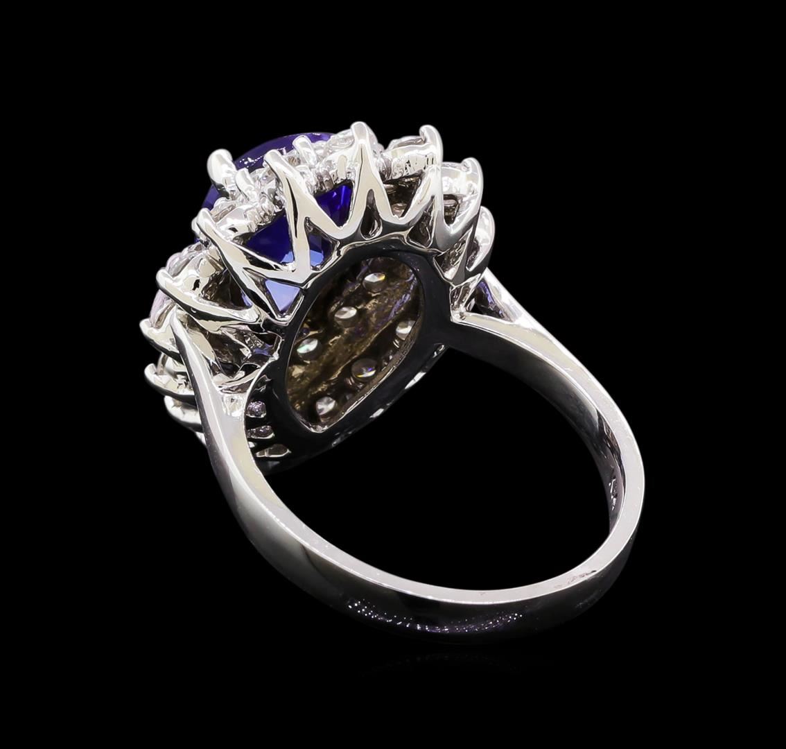 One electronically tested 14KT white gold lady's cast fashion ring with a double halo with a bright polish finish. The featured lady's ring has a shank measuring 2.77 millimeters in width. Identified with markings of "K14". Condition is new, good workmanship. Containing: One prong set pear modified brilliant cut natural tanzanite, measuring 11.42 x 8.67 x 5.40mm, (depth est.) approximate weight of 3.33ct., clarity is eye clean, medium dark, moderately strong, bluish violet color, (GIA bV 6/4), cut is very good. Transmitting light with no distortion, transparent. Colored gemstones are presumed to have been subjected to commonly used enhancement processes. Graded in the setting. Sixteen prong set round brilliant cut diamonds, measuring 2.60 - 2.50 x 1.56mm (depth est.) approximate total weight of 16 Stones = 0.92ct. Graded in the setting. Clarity: SI-1 to SI-2. Color: G - Good Fifteen prong set round brilliant cut diamonds, measuring 2.10 - 2.00 x 1.27mm (depth est.) approximate total weight of 15 Stones = 0.50ct. Graded in the setting. Clarity: SI-1 to SI-2. Color: G - Very Good. Total Weight of Colored Stones 3.33ct. Total Weight of Diamonds 1.42ct. Total Weight of Ring 7.30gm. GAS Appraised at $10,245.00.