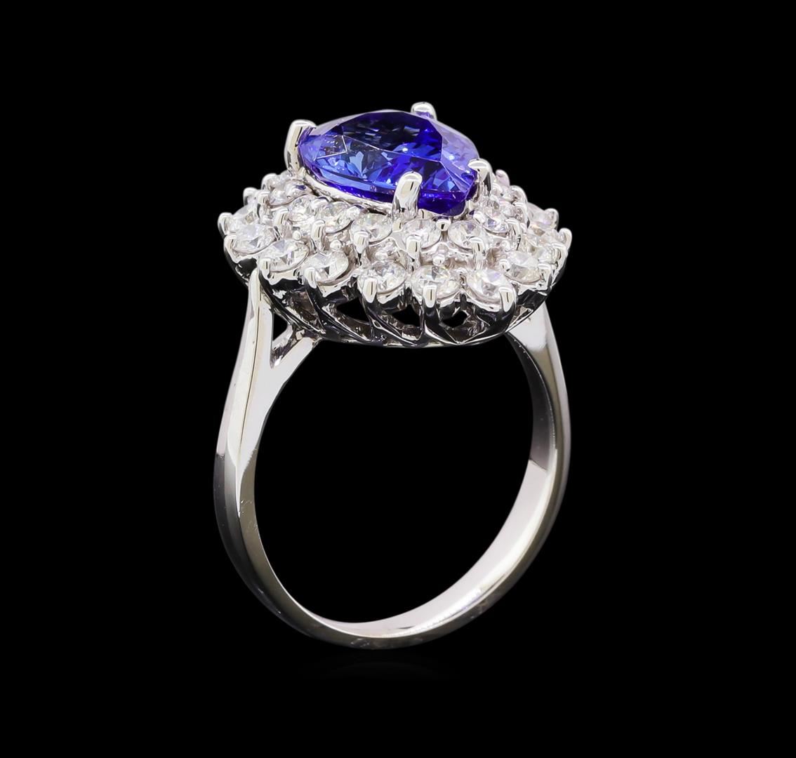 One electronically tested 14KT white gold lady's cast fashion ring with a double halo with a bright polish finish. The featured lady's ring has a shank measuring 2.77 millimeters in width. Identified with markings of "K14". Condition is new, good workmanship. Containing: One prong set pear modified brilliant cut natural tanzanite, measuring 11.42 x 8.67 x 5.40mm, (depth est.) approximate weight of 3.33ct., clarity is eye clean, medium dark, moderately strong, bluish violet color, (GIA bV 6/4), cut is very good. Transmitting light with no distortion, transparent. Colored gemstones are presumed to have been subjected to commonly used enhancement processes. Graded in the setting. Sixteen prong set round brilliant cut diamonds, measuring 2.60 - 2.50 x 1.56mm (depth est.) approximate total weight of 16 Stones = 0.92ct. Graded in the setting. Clarity: SI-1 to SI-2. Color: G - Good Fifteen prong set round brilliant cut diamonds, measuring 2.10 - 2.00 x 1.27mm (depth est.) approximate total weight of 15 Stones = 0.50ct. Graded in the setting. Clarity: SI-1 to SI-2. Color: G - Very Good. Total Weight of Colored Stones 3.33ct. Total Weight of Diamonds 1.42ct. Total Weight of Ring 7.30gm. GAS Appraised at $10,245.00.