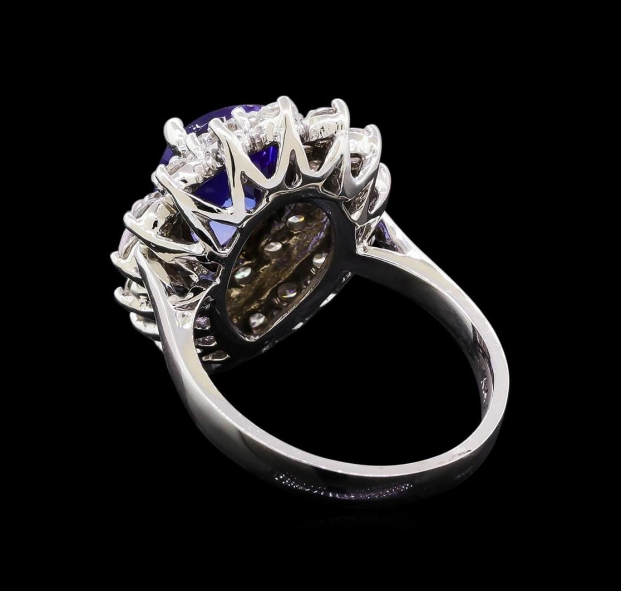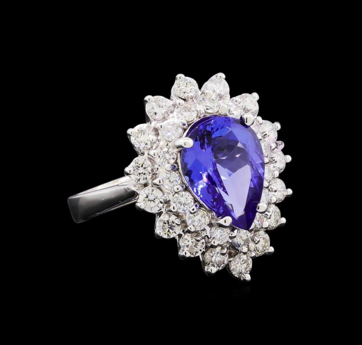 One electronically tested 14KT white gold lady's cast fashion ring with a double halo with a bright polish finish. The featured lady's ring has a shank measuring 2.77 millimeters in width. Identified with markings of "K14". Condition is new, good workmanship. Containing: One prong set pear modified brilliant cut natural tanzanite, measuring 11.42 x 8.67 x 5.40mm, (depth est.) approximate weight of 3.33ct., clarity is eye clean, medium dark, moderately strong, bluish violet color, (GIA bV 6/4), cut is very good. Transmitting light with no distortion, transparent. Colored gemstones are presumed to have been subjected to commonly used enhancement processes. Graded in the setting. Sixteen prong set round brilliant cut diamonds, measuring 2.60 - 2.50 x 1.56mm (depth est.) approximate total weight of 16 Stones = 0.92ct. Graded in the setting. Clarity: SI-1 to SI-2. Color: G - Good Fifteen prong set round brilliant cut diamonds, measuring 2.10 - 2.00 x 1.27mm (depth est.) approximate total weight of 15 Stones = 0.50ct. Graded in the setting. Clarity: SI-1 to SI-2. Color: G - Very Good. Total Weight of Colored Stones 3.33ct. Total Weight of Diamonds 1.42ct. Total Weight of Ring 7.30gm. GAS Appraised.