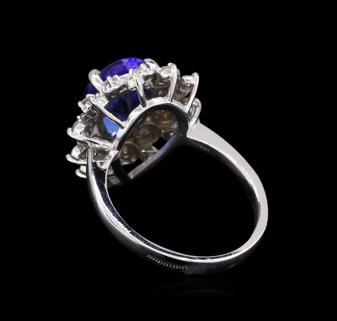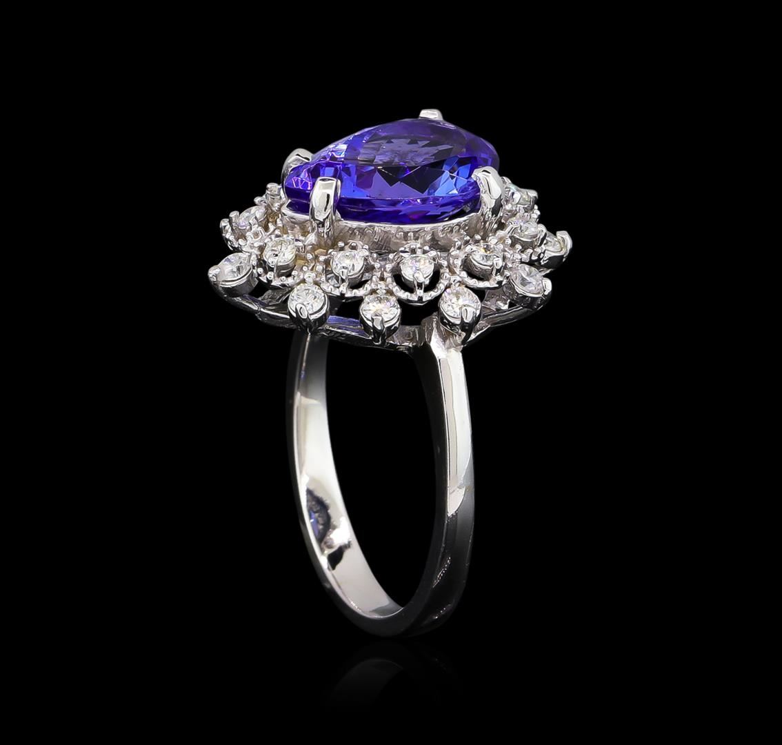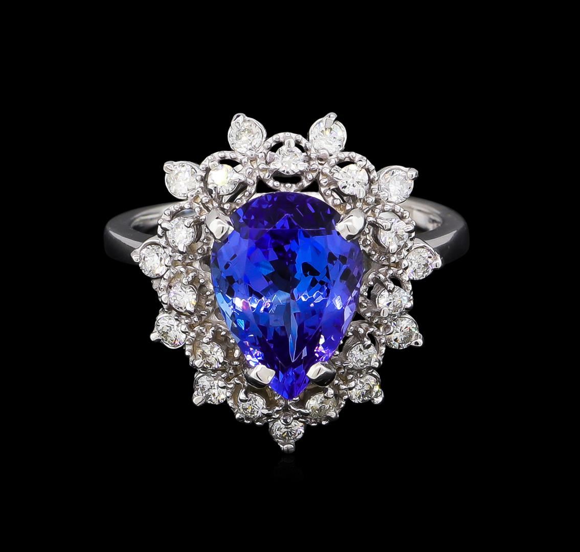 One electronically tested 14KT white gold lady's cast fashion ring with a basket double halo with a bright polish with milgrain detailing finish. The featured lady's ring has a shank measuring 2.58 millimeters wide. Identified with markings of "K14". Condition is new, good workmanship. Containing: One prong set pear modified brilliant cut natural tanzanite, measuring 11.56 x 8.25 x 5.45mm, approximate weight of 3.33ct., clarity is eye clean, type I, medium dark, moderately strong, violetish blue color, (GIA vB 6/4), cut is very good. Transmitting light with no distortion, transparent. Colored gemstones are presumed to have been subjected to commonly used enhancement processes. Graded in the setting. Eleven prong set round brilliant cut diamonds, measuring 1.90 - 1.80 x 1.15mm (depth est.) approximate total weight of 11 Stones = 0.27ct. Graded in the setting. Clarity: SI-1 to SI-2. Color: H - I. Cut Good Eleven prong set round brilliant cut diamonds, measuring 1.70 - 1.60 x 1.04mm (depth est.) approximate total weight of 11 Stones = 0.19ct. Graded in the setting. Clarity: SI-1 to SI-2. Color: H - I. Cut Good. Total Weight of Colored Stones 3.33ct. Total Weight of Diamonds 0.46ct. Total Weight of Ring 5.40gm. GAS Appraised at $7,645.00.