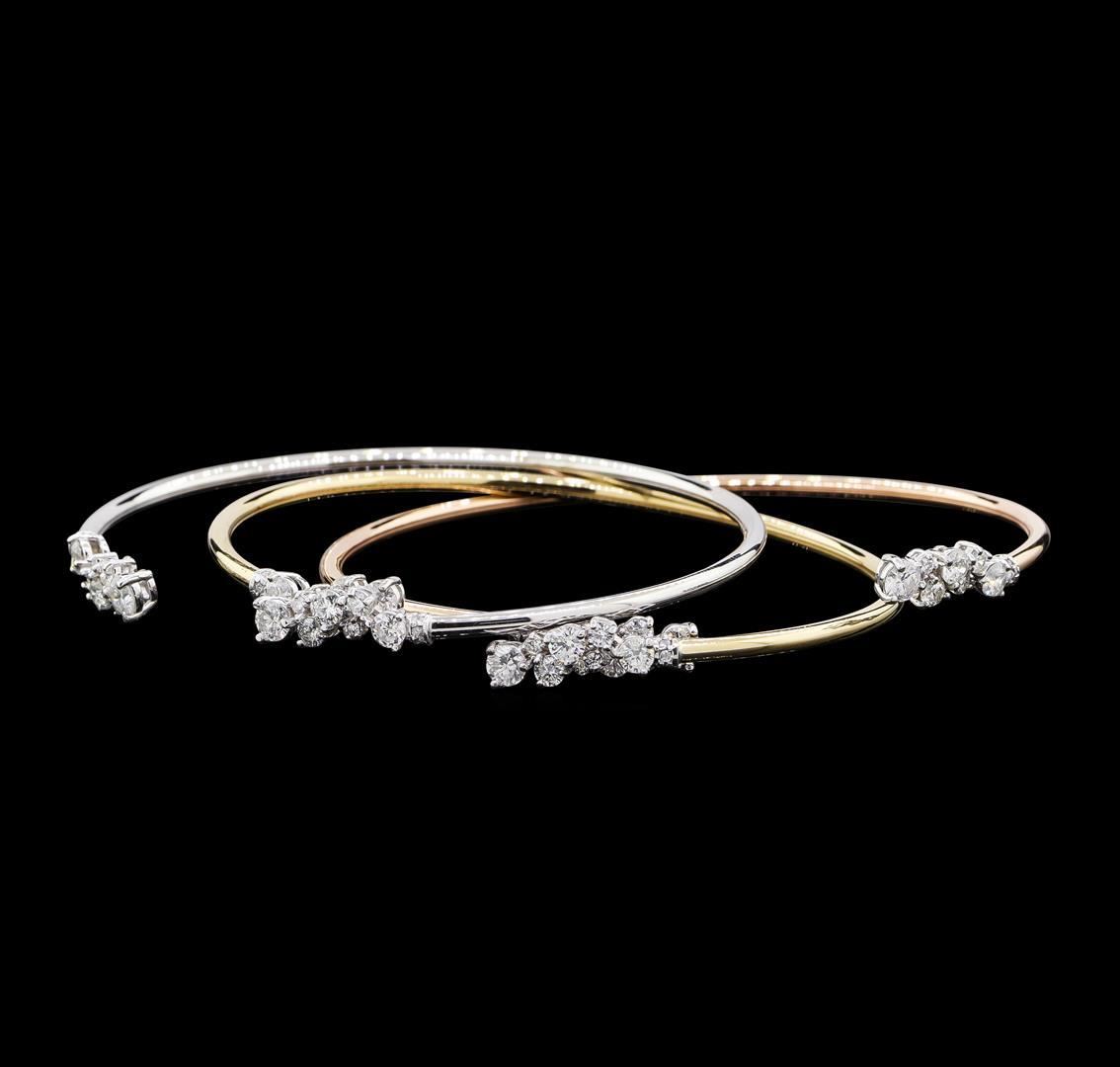 One set electronically tested 14KT yellow, white, and rose gold lady's cast fashion bangle bracelets with a bright polish finish. The featured lady's bracelets measure approximately 7 inches in length. Identified with markings of '585'. Condition is new, good workmanship. Containing: Six prong set round brilliant cut diamonds, measuring 3.55 - 3.45 x 2.14mm (depth est.) approximate total weight of 6 Stones = 0.95ct. Graded in the setting. Clarity SI-1 to I-1. Color: H - I Cut Good Twelve prong set round brilliant cut diamonds, measuring 3.10 - 3.00 x 1.89mm (depth est.) approximate total weight of 12 Stones = 1.30 ct. Graded in the setting. Clarity SI-1 to I-1. Color: H - I Cut Good Six prong set round brilliant cut diamonds, measuring 2.70 - 2.60 x 1.64mm (depth est.) approximate total weight of 6 Stones = 0.43ct. Graded in the setting. Clarity SI-1 to I-1. Color: H - I Cut Good Six prong set round brilliant cut diamonds, measuring 2.50 - 2.45 x 1.54mm (depth est.) approximate total weight of 6 Stones = 0.36ct. Graded in the setting. Clarity SI-1 to SI-2. Color: H - I Cut Good Twelve prong set round brilliant cut diamonds, measuring 1.60 - 1.40 x 0.93mm (depth est.) approximate total weight of 12 Stones = 0.15ct. Graded in the setting. Clarity SI-1 to SI-2. Color: H - I Cut Good Thirty prong set round brilliant cut diamonds, measuring 1.10 - 1.05 x 0.67mm (depth est.) approximate total weight of 30 Stones = 0.15ct. Graded in the setting. Clarity SI-1 to I-1. Color: H - I Cut Good. Total Weight of Diamonds 3.34ct.. Total Weight of Bangle Bracelets 14.00gm. GAS Appraised.