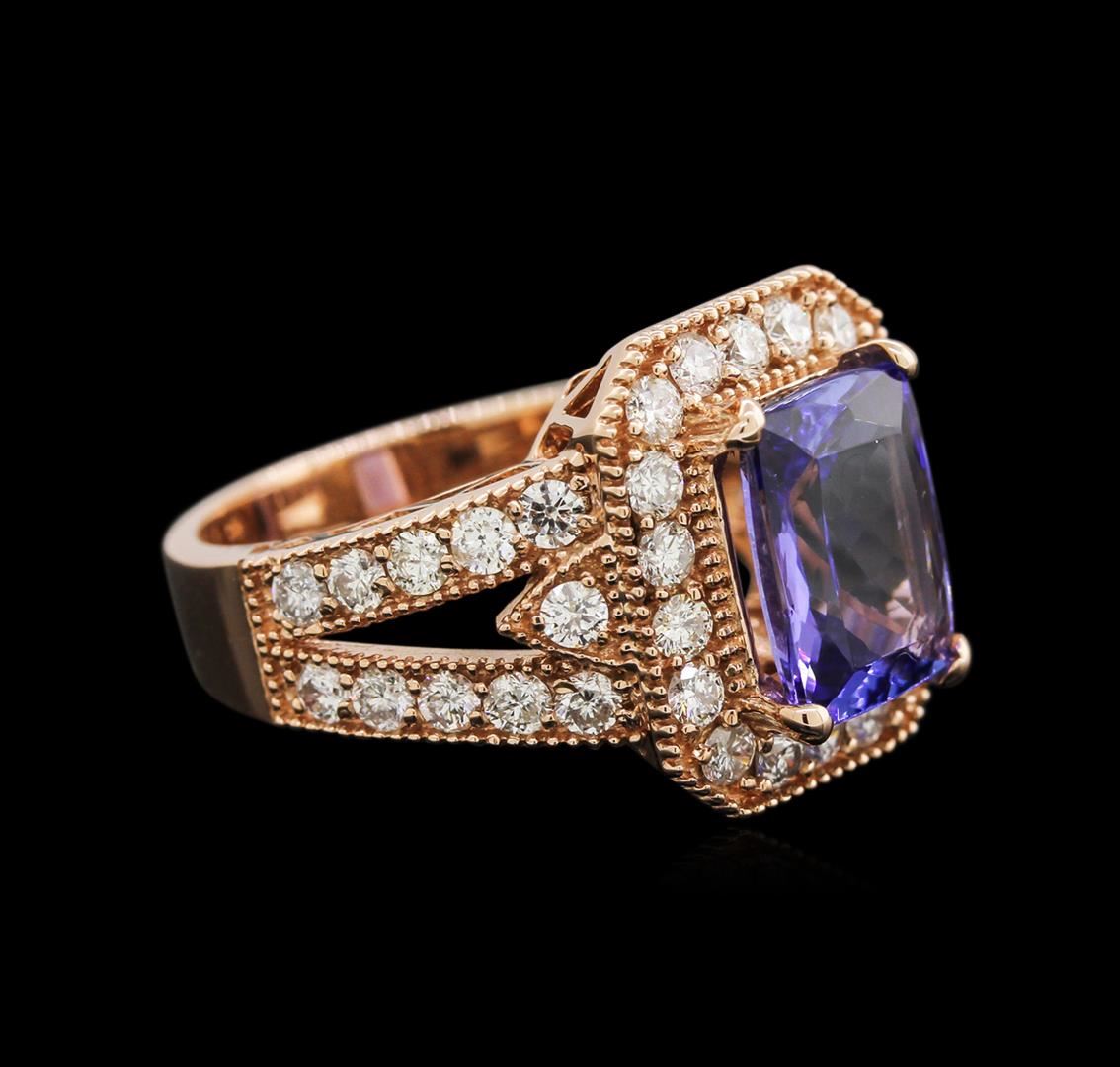 One electronically tested 14KT rose gold lady's cast fashion ring with a split shank with a bright polish with milgrain detailing finish. The featured lady's ring has a halo motif and shank measuring 4.43 millimeters wide. Identified with markings of "14K". Condition is new, good workmanship. Containing: One prong set rectangular cushion modified brilliant cut natural tanzanite, measuring 10.37 x 7.66 x 4.71mm, 10% bulge factor, approximate weight of 3.34ct., clarity is eye clean, type I, medium, very slightly grayish, violetish blue color, (GIA vB 5/3), cut is good. Transmitting light with no distortion, transparent. Colored gemstones are presumed to have been subjected to commonly used enhancement processes. Graded in the setting. Forty prong set round brilliant cut diamonds, measuring 2.10 - 2.00 x 1.33mm (depth est.) approximate total weight of 40 Stones = 1.38ct. Graded in the setting. Clarity: SI-2 to I-1. Color: H - I. Cut Good. Total Weight of Colored Stones 3.34ct. Total Weight of Diamonds 1.38ct. Total Weight of Ring 8.40gm. GAS Appraised at $9,310.00.