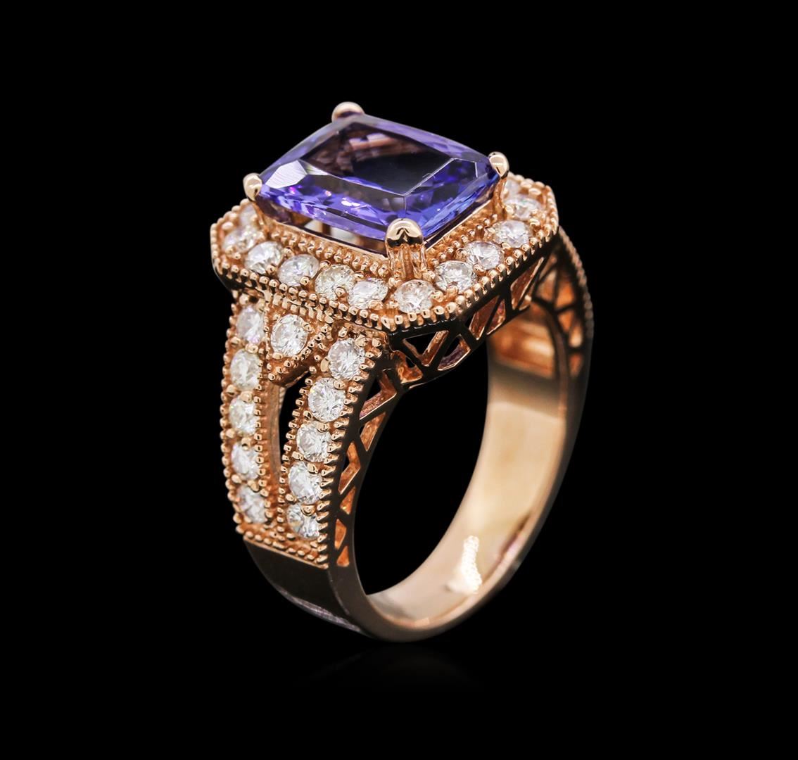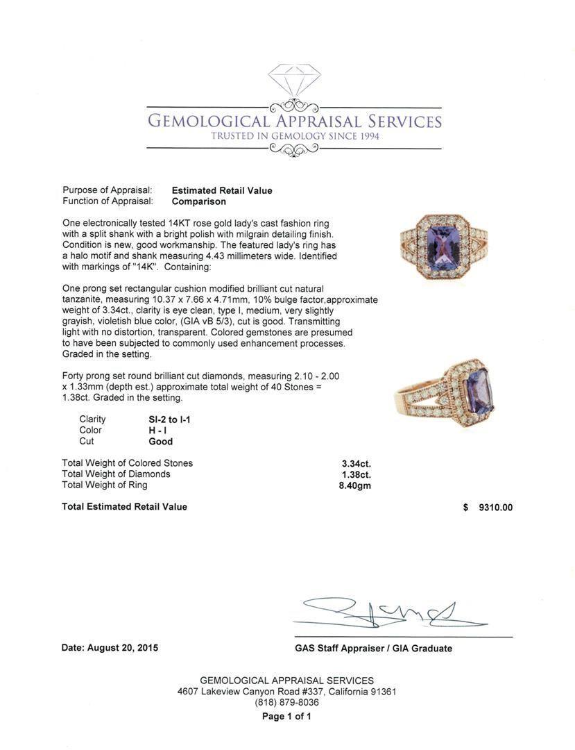 One electronically tested 14KT rose gold lady's cast fashion ring with a split shank with a bright polish with milgrain detailing finish. The featured lady's ring has a halo motif and shank measuring 4.43 millimeters wide. Identified with markings of "14K". Condition is new, good workmanship. Containing: One prong set rectangular cushion modified brilliant cut natural tanzanite, measuring 10.37 x 7.66 x 4.71mm, 10% bulge factor, approximate weight of 3.34ct., clarity is eye clean, type I, medium, very slightly grayish, violetish blue color, (GIA vB 5/3), cut is good. Transmitting light with no distortion, transparent. Colored gemstones are presumed to have been subjected to commonly used enhancement processes. Graded in the setting. Forty prong set round brilliant cut diamonds, measuring 2.10 - 2.00 x 1.33mm (depth est.) approximate total weight of 40 Stones = 1.38ct. Graded in the setting. Clarity: SI-2 to I-1. Color: H - I. Cut Good. Total Weight of Colored Stones 3.34ct. Total Weight of Diamonds 1.38ct. Total Weight of Ring 8.40gm. GAS Appraised at $9,310.00.