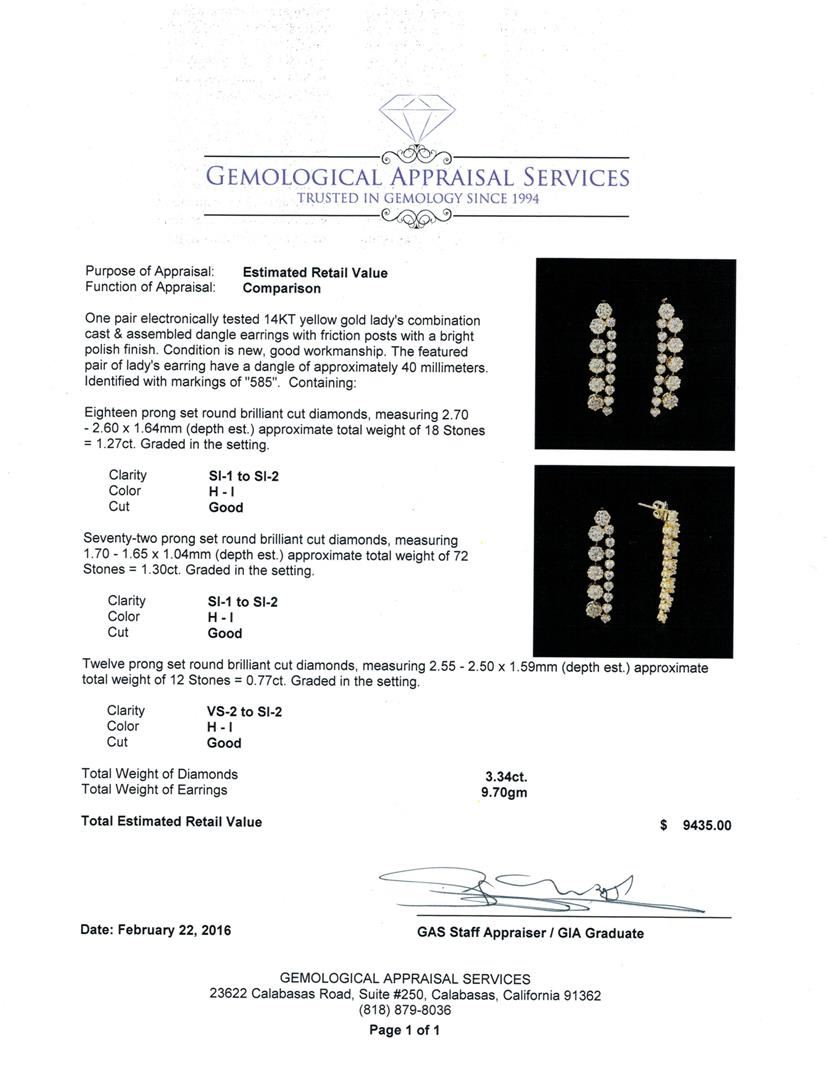One pair electronically tested 14KT yellow gold lady's combination cast & assembled dangle earrings with friction posts with a bright polish finish. The featured pair of lady's earring have a dangle of approximately 40 millimeters. Identified with markings of "585". Condition is new, good workmanship. Containing: Eighteen prong set round brilliant cut diamonds, measuring 2.70 - 2.60 x 1.64mm (depth est.) approximate total weight of 18 Stones = 1.27ct. Graded in the setting. Clarity: SI-1 to SI-2. Color: H - I. Cut Good Seventy-Two prong set round brilliant cut diamonds, measuring 1.70 - 1.65 x 1.04mm (depth est.) approximate total weight of 72 Stones = 1.30ct. Graded in the setting. Clarity: SI-1 to SI-2. Color: H - I. Cut Good Twelve prong set round brilliant cut diamonds, measuring 2.55 - 2.50 x 1.59mm (depth est.) approximate total weight of 12 Stones = 0.77ct. Graded in the setting. Clarity: VS-2 to SI-2. Color: H - I. Cut Good. Total Weight of Diamonds 3.34ct. Total Weight of Earrings 9.70gm. GAS Appraised at $9,435.00.