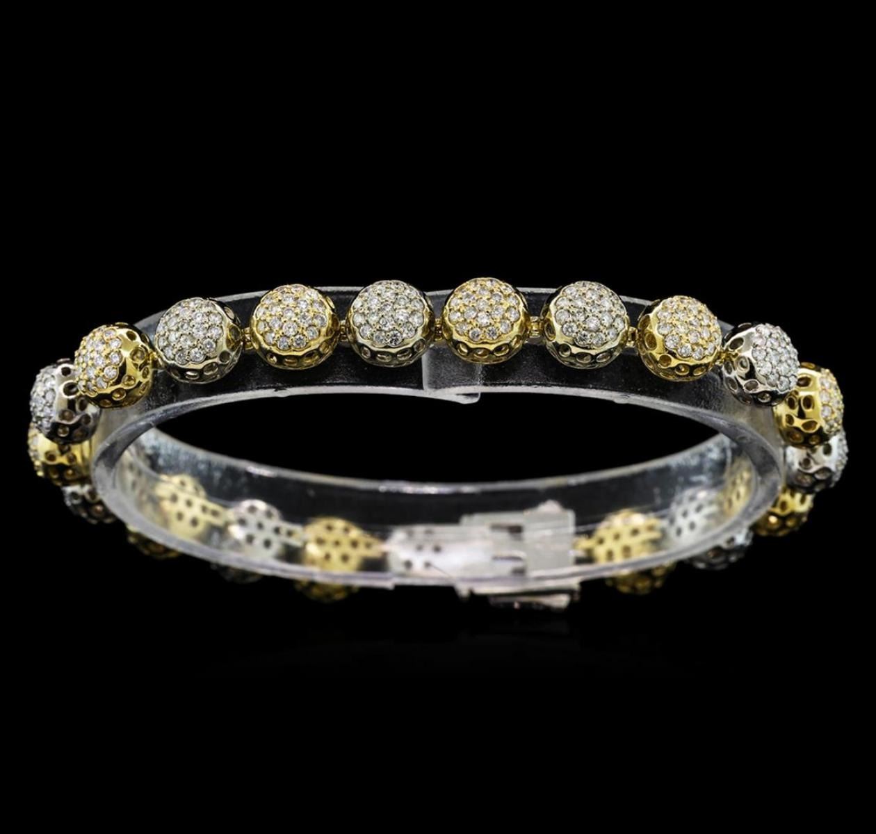 One electronically tested 14KT white and yellow gold lady's combination cast & assembled fashion bracelet with a double plunger clasp with a bright polish finish. The featured lady's bracelet is a collection of round diamond cluster beads and measures approximately 7 inches in length. Identified with markings of 'K14'. Condition is new, good workmanship. Containing: Three Hundred Ninety-Nine prong set round brilliant cut diamonds, measuring 1.35 - 1.25 x 0.81mm (depth est.) approximate total weight of 399 Stones = 3.35ct. Graded in the setting. Clarity SI-1 to I-1. Color: G - I Cut Good. Total Weight of Diamonds 3.35ct.. Total Weight of Bracelet 20.20gm GAS Appraised.
