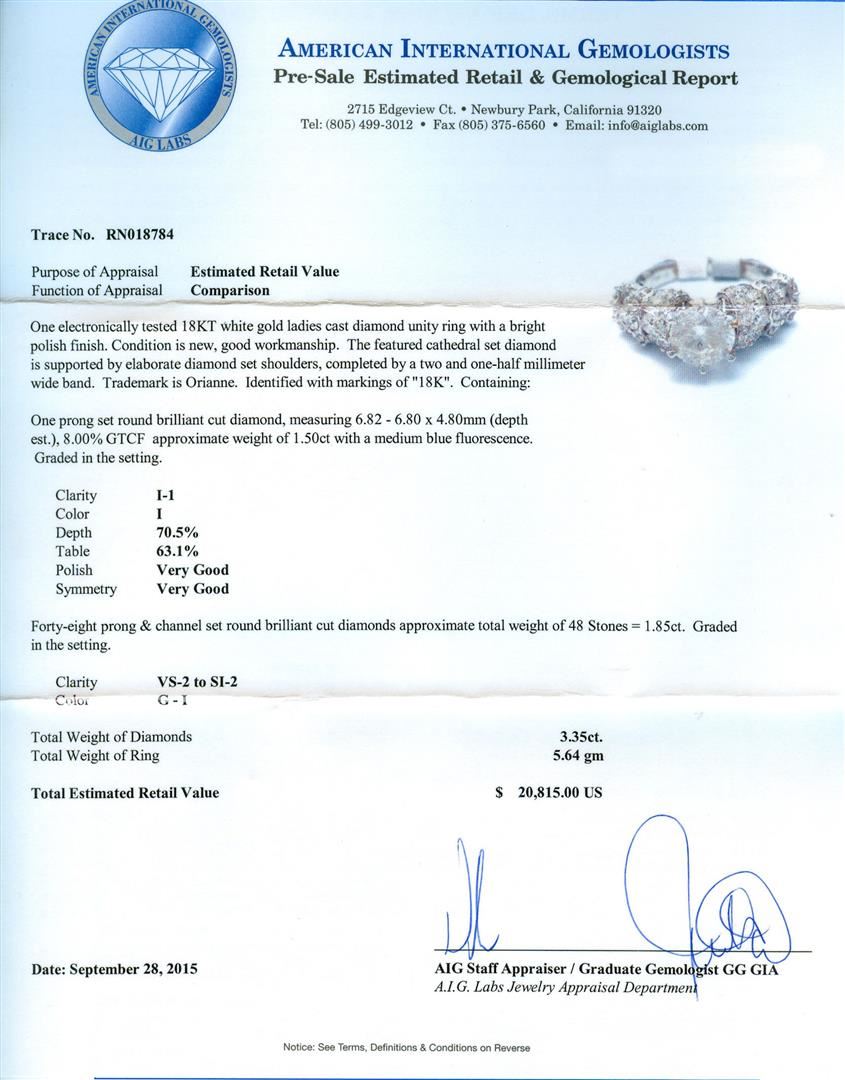 One electronically tested 18KT white gold ladies cast diamond unity ring with a bright polish finish. The featured cathedral set diamond is supported by elaborate diamond set shoulders, completed by a two and one-half millimeter wide band. Trademark is Orianne. Identified with markings of "18K". Condition is new, good workmanship. Containing: One prong set round brilliant cut diamond, measuring 6.82 - 6.80 x 4.80mm (depth est.), 8.00.%. GTCF approximate weight of 1.50ct with a medium blue fluorescence. Graded in the setting. Clarity: I-1. Color: I. Depth 70.5%. Table 63.1%. Forty-Eight prong & channel set round brilliant cut diamonds approximate total weight of 48 Stones = 1.85ct. Graded in the setting. Clarity: VS-2 to SI-2. Color: G - I. Total Weight of Diamonds 3.35ct. Total Weight of Ring 5.64gm. AIG Appraised at $20,815.00.