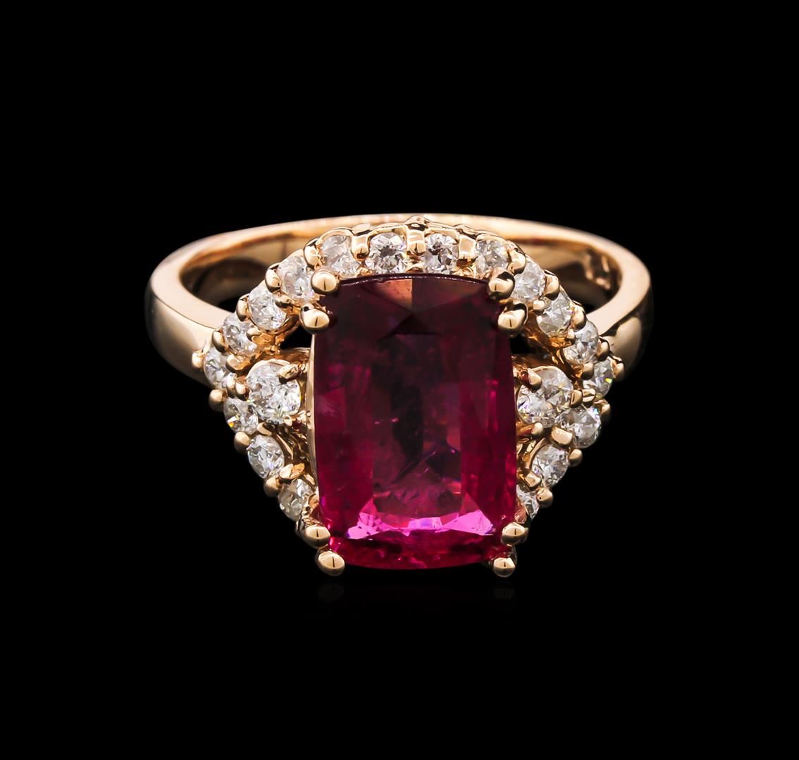 One electronically tested 14KT rose gold lady's cast fashion ring with a split shank with a bright polish finish. The featured lady's ring has a basket halo motif and a shank measuring 2.59 millimeters wide. Identified with markings of "K14". Condition is new, good workmanship. Containing: One prong set rectangular cushion modified brilliant cut natural pink tourmaline, measuring 11.55 x 7.52 x 4.57mm, 17% bulge factor, approximate weight of 3.35ct., clarity is moderately included, type II, medium, moderately strong, slightly purplish red color, (GIA slpR 5/4), cut is good. Transmitting light somewhat diffusely, transparent to translucent. Colored gemstones are presumed to have been subjected to commonly used enhancement processes. Graded in the setting. Two prong set round brilliant cut diamonds, measuring 2.40 - 2.35 x 1.48mm (depth est.) approximate total weight of 2 Stones = 0.10ct. Graded in the setting. Clarity: SI-2 to I-1. Color: H - I. Cut Good Twenty-Two prong set round brilliant cut diamonds, measuring 1.80 - 1.75 x 1.10mm (depth est.) approximate total weight of 22 Stones = 0.47ct. Graded in the setting. Clarity: SI-2 to I-1. Color: H - I. Cut Good. Total Weight of Colored Stones 3.35ct. Total Weight of Diamonds 0.57ct. Total Weight of Ring 5.70gm. GAS Appraised at $4,245.00.