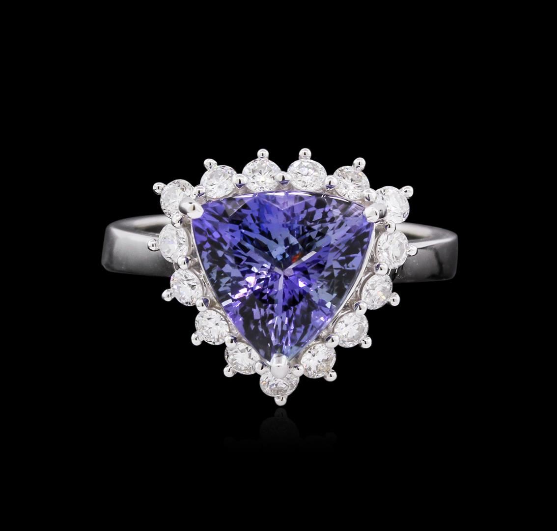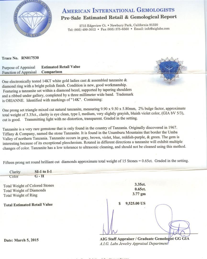 One electronically tested 14KT white gold ladies cast & assembled tanzanite & diamond ring with a bright polish finish. Featuring a tanzanite set within a diamond bezel, supported by tapering shoulders and a ribbed under gallery, completed by a three millimeter wide band. Trademark is ORIANNE. Identified with markings of "14K". Condition is new, good workmanship. Containing: One prong set triangle mixed cut natural tanzanite, measuring 9.90 x 9.50 x 5.80mm, 2%. bulge factor, approximate total weight of 3.35ct., clarity is eye clean, type I, medium, very slightly grayish, bluish violet color, (GIA bV 5/3), cut is good. Transmitting light with no distortion, transparent. Graded in the setting. Tanzanite is a very rare gemstone that is only found in the country of Tanzania. Originally discovered in 1967. Tiffany & Company, named the stone Tanzanite. It is found in the Usumburu Mountains that border the Umba Valley of northern Tanzania. Tanzanite occurs in gray, brown, violet, blue, reddish-purple, & green. The gem is interesting because of its exceptional pleochroism. Rotated in different directions a tanzanite will exhibit multiple changes of color. Tanzanite has a low tolerance to ultrasonic cleaning, and should not be cleaned using this method. Fifteen prong set round brilliant cut diamonds approximate total weight of 15 Stones = 0.65ct. Graded in the setting. Clarity: SI-1 to I-1. Color: G - H. Total Weight of Colored Stones 3.35ct. Total Weight of Diamonds 0.65ct. AIG Appraised at $9,525.00.