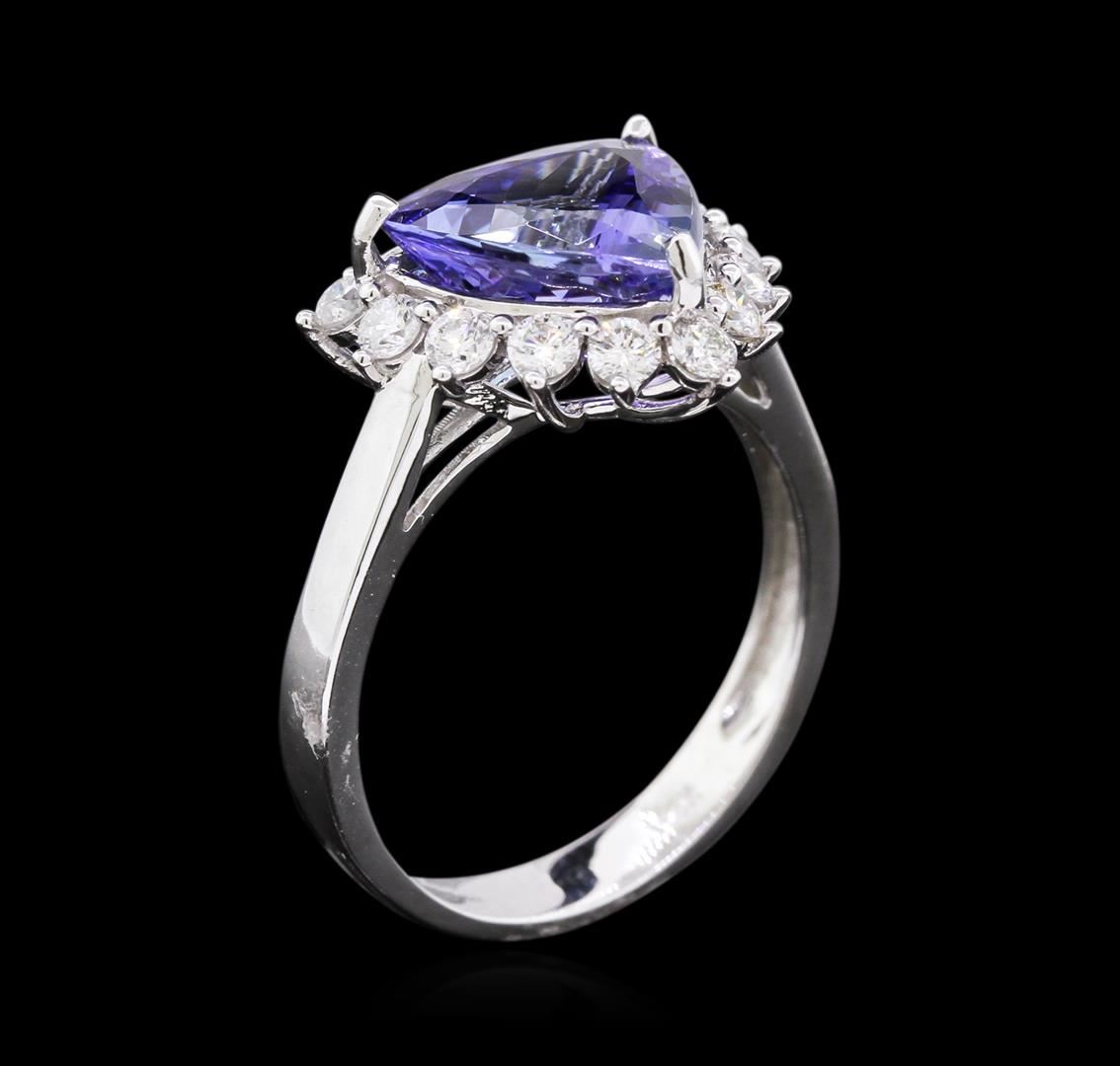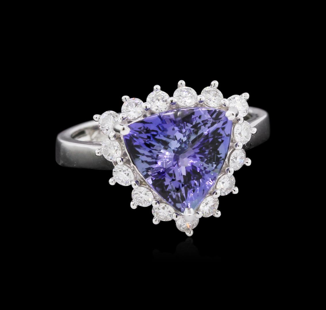 One electronically tested 14KT white gold ladies cast & assembled tanzanite & diamond ring with a bright polish finish. Featuring a tanzanite set within a diamond bezel, supported by tapering shoulders and a ribbed under gallery, completed by a three millimeter wide band. Trademark is ORIANNE. Identified with markings of "14K". Condition is new, good workmanship. Containing: One prong set triangle mixed cut natural tanzanite, measuring 9.90 x 9.50 x 5.80mm, 2%. bulge factor, approximate total weight of 3.35ct., clarity is eye clean, type I, medium, very slightly grayish, bluish violet color, (GIA bV 5/3), cut is good. Transmitting light with no distortion, transparent. Graded in the setting. Tanzanite is a very rare gemstone that is only found in the country of Tanzania. Originally discovered in 1967. Tiffany & Company, named the stone Tanzanite. It is found in the Usumburu Mountains that border the Umba Valley of northern Tanzania. Tanzanite occurs in gray, brown, violet, blue, reddish-purple, & green. The gem is interesting because of its exceptional pleochroism. Rotated in different directions a tanzanite will exhibit multiple changes of color. Tanzanite has a low tolerance to ultrasonic cleaning, and should not be cleaned using this method. Fifteen prong set round brilliant cut diamonds approximate total weight of 15 Stones = 0.65ct. Graded in the setting. Clarity: SI-1 to I-1. Color: G - H. Total Weight of Colored Stones 3.35ct. Total Weight of Diamonds 0.65ct. AIG Appraised at $9,525.00.