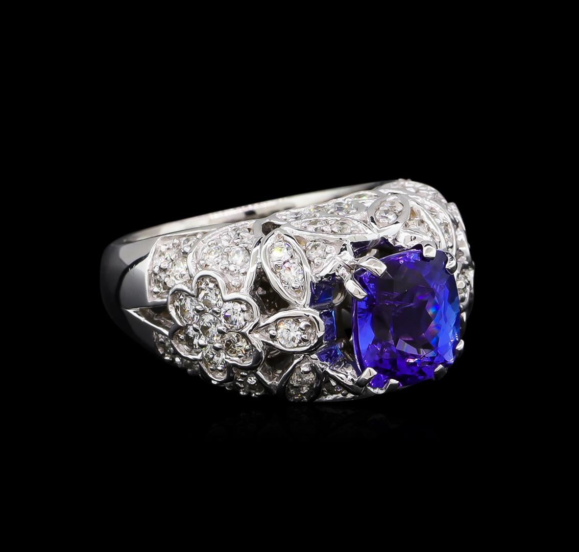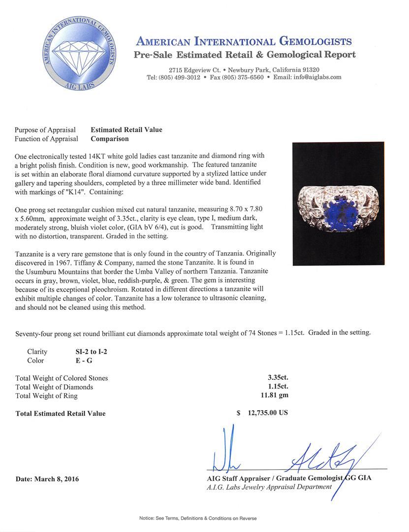 One electronically tested 14KT white gold ladies cast tanzanite and diamond ring with a bright polish finish. The featured tanzanite is set within an elaborate floral diamond curvature supported by a stylized lattice under gallery and tapering shoulders, completed by a three millimeter wide band. Identified with markings of "K14". Condition is new, good workmanship. Containing: One prong set rectangular cushion mixed cut natural tanzanite, measuring 8.70 x 7.80 x 5.60mm, approximate weight of 3.35ct., clarity is eye clean, type I, medium dark, moderately strong, bluish violet color, (GIA bV 6/4), cut is good. Transmitting light with no distortion, transparent. Graded in the setting. Tanzanite is a very rare gemstone that is only found in the country of Tanzania. Originally discovered in 1967. Tiffany & Company, named the stone Tanzanite. It is found in the Usumburu Mountains that border the Umba Valley of northern Tanzania. Tanzanite occurs in gray, brown, violet, blue, reddish-purple, & green. The gem is interesting because of its exceptional pleochroism. Rotated in different directions a tanzanite will exhibit multiple changes of color. Tanzanite has a low tolerance to ultrasonic cleaning, and should not be cleaned using this method. Seventy-Four prong set round brilliant cut diamonds approximate total weight of 74 Stones = 1.15ct. Graded in the setting. Clarity: SI-2 to I-2. Color: E - G. Total Weight of Colored Stones 3.35ct. Total Weight of Diamonds 1.15ct. Total Weight of Ring 11.81gm. AIG Appraised at $12,735.00.