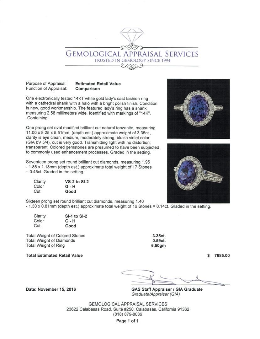 One electronically tested 14KT white gold lady's cast fashion ring with a cathedral shank with a halo with a bright polish finish. The featured lady's ring has a shank measuring 2.58 millimeters wide. Identified with markings of '14K'. Condition is new, good workmanship. Containing: One prong set oval modified brilliant cut natural tanzanite, measuring 11.00 x 8.25 x 5.51mm, (depth est.) approximate weight of 3.35ct., clarity is eye clean, medium, moderately strong, bluish violet color, (GIA bV 5/4), cut is very good. Transmitting light with no distortion, transparent. Colored gemstones are presumed to have been subjected to commonly used enhancement processes. Graded in the setting. Seventeen prong set round brilliant cut diamonds, measuring 1.95 - 1.85 x 1.18mm (depth est.) approximate total weight of 17 Stones = 0.45ct. Graded in the setting. Clarity VS-2 to SI-2. Color: G - H Cut Good Sixteen prong set round brilliant cut diamonds, measuring 1.40 - 1.30 x 0.81mm (depth est.) approximate total weight of 16 Stones = 0.14ct. Graded in the setting. Clarity SI-1 to SI-2. Color: G - H Cut Good. Total Weight of Colored Stones 3.35ct.. Total Weight of Diamonds 0.59ct.. Total Weight of Ring 6.50gm. GAS Appraised at $7,685.00.