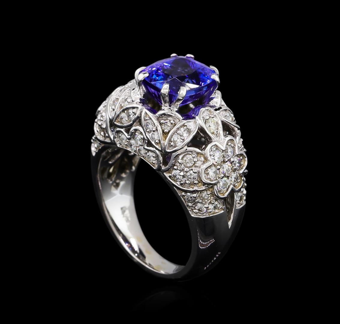 One electronically tested 14KT white gold ladies cast tanzanite and diamond ring with a bright polish finish. The featured tanzanite is set within an elaborate floral diamond curvature supported by a stylized lattice under gallery and tapering shoulders, completed by a three millimeter wide band. Identified with markings of "K14". Condition is new, good workmanship. Containing: One prong set rectangular cushion mixed cut natural tanzanite, measuring 8.70 x 7.80 x 5.60mm, approximate weight of 3.35ct., clarity is eye clean, type I, medium dark, moderately strong, bluish violet color, (GIA bV 6/4), cut is good. Transmitting light with no distortion, transparent. Graded in the setting. Tanzanite is a very rare gemstone that is only found in the country of Tanzania. Originally discovered in 1967. Tiffany & Company, named the stone Tanzanite. It is found in the Usumburu Mountains that border the Umba Valley of northern Tanzania. Tanzanite occurs in gray, brown, violet, blue, reddish-purple, & green. The gem is interesting because of its exceptional pleochroism. Rotated in different directions a tanzanite will exhibit multiple changes of color. Tanzanite has a low tolerance to ultrasonic cleaning, and should not be cleaned using this method. Seventy-Four prong set round brilliant cut diamonds approximate total weight of 74 Stones = 1.15ct. Graded in the setting. Clarity: SI-2 to I-2. Color: E - G. Total Weight of Colored Stones 3.35ct. Total Weight of Diamonds 1.15ct. Total Weight of Ring 11.81gm. AIG Appraised at $12,735.00.