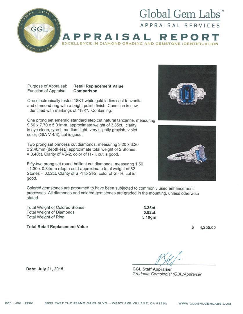 One electronically tested 18KT white gold ladies cast tanzanite and diamond ring with a bright polish finish. Identified with markings of "18K". Condition is new. Containing: One prong set emerald standard step cut natural tanzanite, measuring 9.60 x 7.70 x 5.01mm, approximate weight of 3.35ct., clarity is eye clean, type I, medium light, very slightly grayish, violet color, (GIA V 4/3), cut is good. Two prong set princess cut diamonds, measuring 3.20 x 3.20 x 2.40mm (depth est.) approximate total weight of 2 Stones = 0.40ct. Clarity: VS-2. Color: H - I, Cut is Good. Fifty-Two prong set round brilliant cut diamonds, measuring 1.50 - 1.30 x 0.84mm (depth est.) approximate total weight of 52 Stones = 0.52ct. Clarity: SI-1 to SI-2. Color: G - H, Cut is Good. Colored gemstones are presumed to have been subjected to commonly used enhancement processes. All diamonds and colored gemstones are graded in the mounting, unless otherwise stated. Total Weight of Colored Stones 3.35ct. Total Weight of Diamonds 0.92ct. Total Weight of Ring 5.10gm. GGL Appraised at $4,255.00.