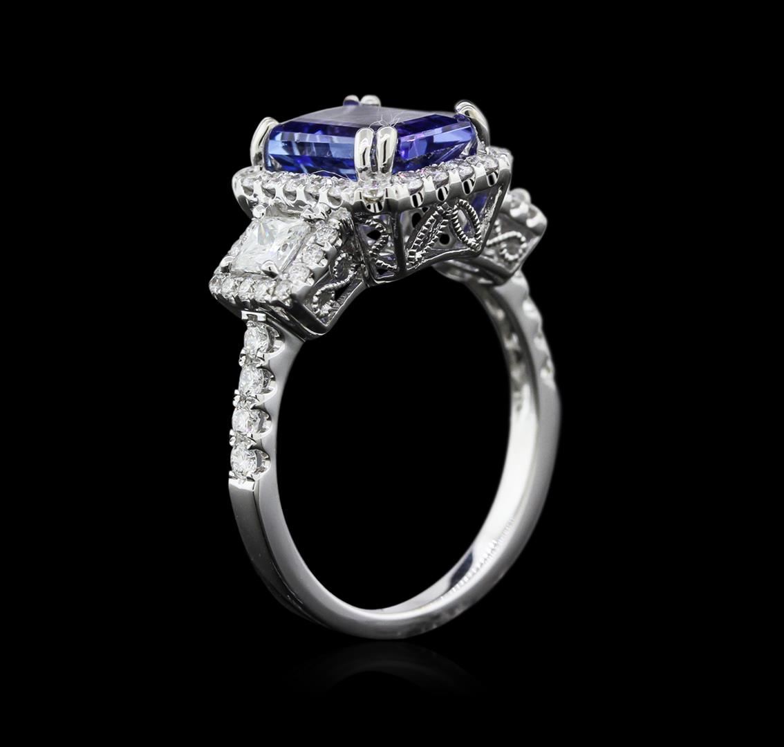 One electronically tested 18KT white gold ladies cast tanzanite and diamond ring with a bright polish finish. Identified with markings of "18K". Condition is new. Containing: One prong set emerald standard step cut natural tanzanite, measuring 9.60 x 7.70 x 5.01mm, approximate weight of 3.35ct., clarity is eye clean, type I, medium light, very slightly grayish, violet color, (GIA V 4/3), cut is good. Two prong set princess cut diamonds, measuring 3.20 x 3.20 x 2.40mm (depth est.) approximate total weight of 2 Stones = 0.40ct. Clarity: VS-2. Color: H - I, Cut is Good. Fifty-Two prong set round brilliant cut diamonds, measuring 1.50 - 1.30 x 0.84mm (depth est.) approximate total weight of 52 Stones = 0.52ct. Clarity: SI-1 to SI-2. Color: G - H, Cut is Good. Colored gemstones are presumed to have been subjected to commonly used enhancement processes. All diamonds and colored gemstones are graded in the mounting, unless otherwise stated. Total Weight of Colored Stones 3.35ct. Total Weight of Diamonds 0.92ct. Total Weight of Ring 5.10gm. GGL Appraised at $4,255.00.