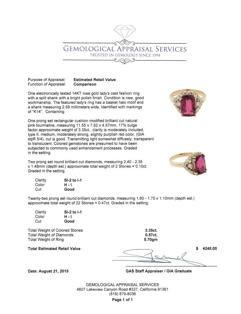 One electronically tested 14KT rose gold lady's cast fashion ring with a split shank with a bright polish finish. The featured lady's ring has a basket halo motif and a shank measuring 2.59 millimeters wide. Identified with markings of "K14". Condition is new, good workmanship. Containing: One prong set rectangular cushion modified brilliant cut natural pink tourmaline, measuring 11.55 x 7.52 x 4.57mm, 17% bulge factor, approximate weight of 3.35ct., clarity is moderately included, type II, medium, moderately strong, slightly purplish red color, (GIA slpR 5/4), cut is good. Transmitting light somewhat diffusely, transparent to translucent. Colored gemstones are presumed to have been subjected to commonly used enhancement processes. Graded in the setting. Two prong set round brilliant cut diamonds, measuring 2.40 - 2.35 x 1.48mm (depth est.) approximate total weight of 2 Stones = 0.10ct. Graded in the setting. Clarity: SI-2 to I-1. Color: H - I. Cut Good Twenty-Two prong set round brilliant cut diamonds, measuring 1.80 - 1.75 x 1.10mm (depth est.) approximate total weight of 22 Stones = 0.47ct. Graded in the setting. Clarity: SI-2 to I-1. Color: H - I. Cut Good. Total Weight of Colored Stones 3.35ct. Total Weight of Diamonds 0.57ct. Total Weight of Ring 5.70gm. GAS Appraised at $4,245.00.