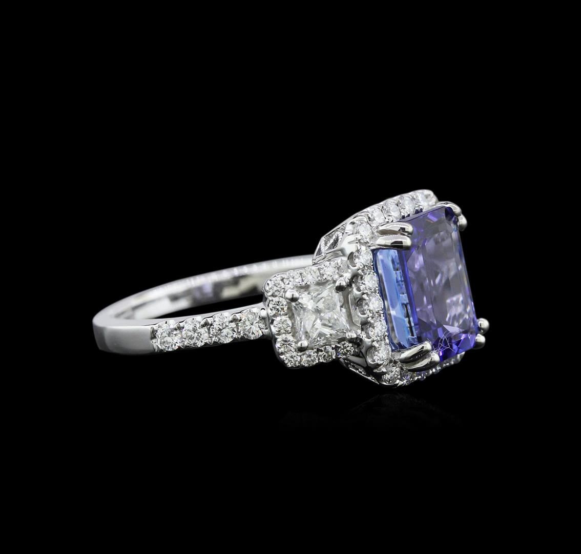 One electronically tested 18KT white gold ladies cast tanzanite and diamond ring with a bright polish finish. Identified with markings of "18K". Condition is new. Containing: One prong set emerald standard step cut natural tanzanite, measuring 9.60 x 7.70 x 5.01mm, approximate weight of 3.35ct., clarity is eye clean, type I, medium light, very slightly grayish, violet color, (GIA V 4/3), cut is good. Two prong set princess cut diamonds, measuring 3.20 x 3.20 x 2.40mm (depth est.) approximate total weight of 2 Stones = 0.40ct. Clarity: VS-2. Color: H - I, Cut is Good. Fifty-Two prong set round brilliant cut diamonds, measuring 1.50 - 1.30 x 0.84mm (depth est.) approximate total weight of 52 Stones = 0.52ct. Clarity: SI-1 to SI-2. Color: G - H, Cut is Good. Colored gemstones are presumed to have been subjected to commonly used enhancement processes. All diamonds and colored gemstones are graded in the mounting, unless otherwise stated. Total Weight of Colored Stones 3.35ct. Total Weight of Diamonds 0.92ct. Total Weight of Ring 5.10gm. GGL Appraised at $4,255.00.