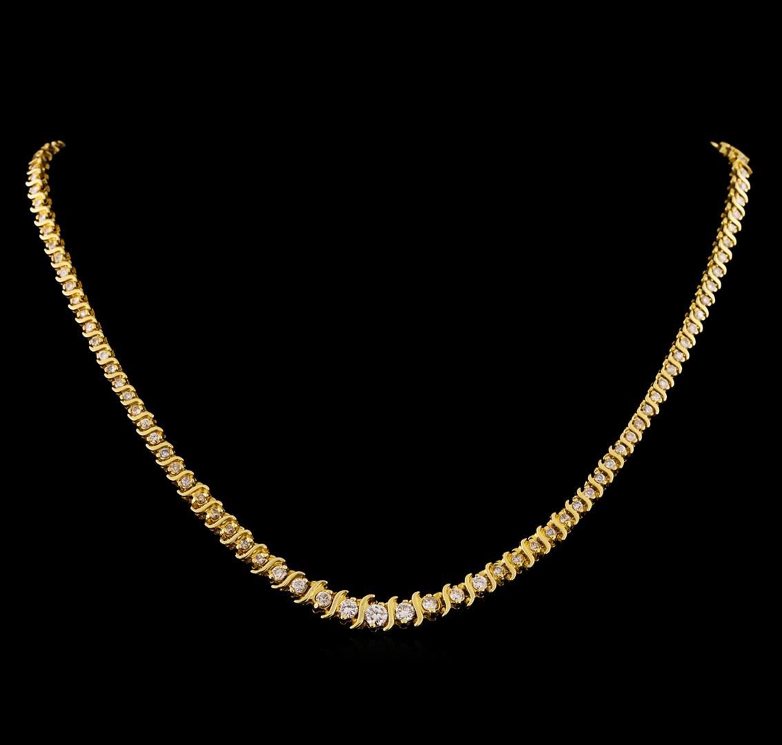 One electronically tested 14KT yellow gold ladies cast & assembled diamond tennis necklace. Sixteen inch length chevron style tennis necklace features a flexible graduating diamond ribbon, terminating in a concealed clasp with safety. Bright polish finish. Tennis bracelets & necklaces got their unusual name from an incident involving the U.S. professional tennis player Chris Evert during a tennis match in the 1980's. Evert had been wearing an expensive diamond bracelet, an inline string of individually-set diamonds. Previously these bracelets were known as eternity bracelets. When the clasp snapped during play, she asked the officials to stop the tennis match until the bracelet could be found. Since that day, bracelets and necklaces featuring an inline string of diamonds have been called tennis bracelets and tennis necklaces. Identified with markings of "14K". Condition is good. Containing: Three prong set round brilliant cut diamonds, measuring 4.30 - 3.50 x 2.39mm (depth est.) approximate total weight of 3 Stones = 0.62ct. Graded in the setting. Clarity: SI-2 to I-1. Color: H - I Six prong set round brilliant cut diamonds, measuring 2.90 - 2.70 x 1.68mm (depth est.) approximate total weight of 6 Stones = 0.48ct. Graded in the setting. Clarity: SI-2 to I-1. Color: H - J One Hundred Six prong set round brilliant cut diamonds, measuring 2.00 - 1.60 x 1.08mm (depth est.) approximate total weight of 106 Stones = 2.26ct. The color grade reflects the overall average for the group. Graded in the setting. Clarity: I-1 to I-2. Color: H - J. Total Weight of Diamonds 3.36ct. Total Weight of Necklace 29.27gm. AIG Appraised at $13,110.00.