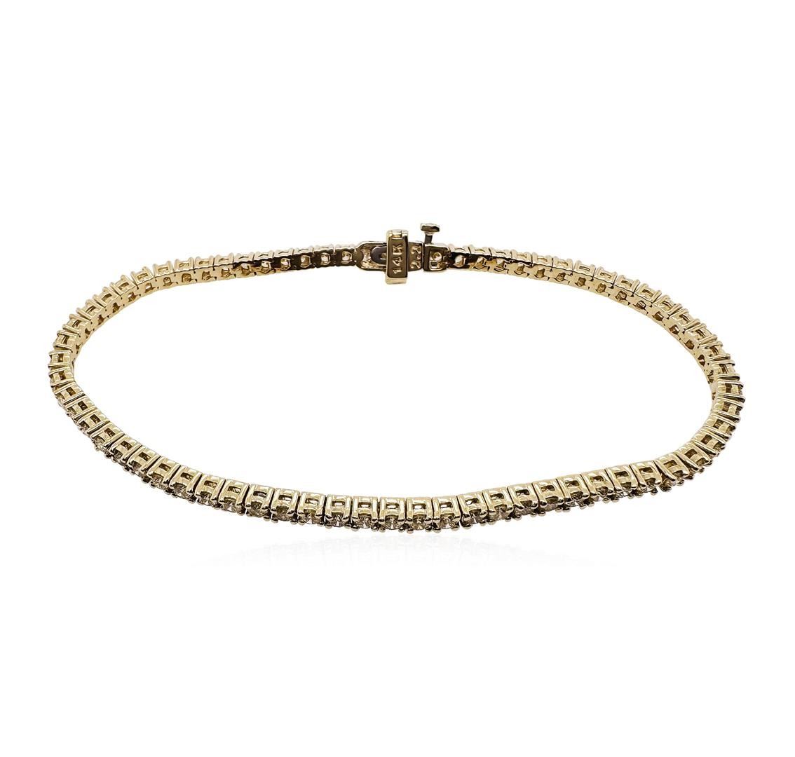 One electronically tested 14KT white gold lady's combination cast & assembled fashion straight line tennis bracelet with a tongue clasp with fold-under safety with a basket motif with a bright polish finish. Condition is new, good workmanship. The featured lady's bracelet measures approximately 7.00 inches in length. Identified with markings of 14K. Containing: 69 prong set round brilliant cut diamonds, approximate total weight of 69 stones = 3.36 ctw. Graded in the setting. Total weight of Diamonds: 3.36 ctw. Total estimated retail value: $9370