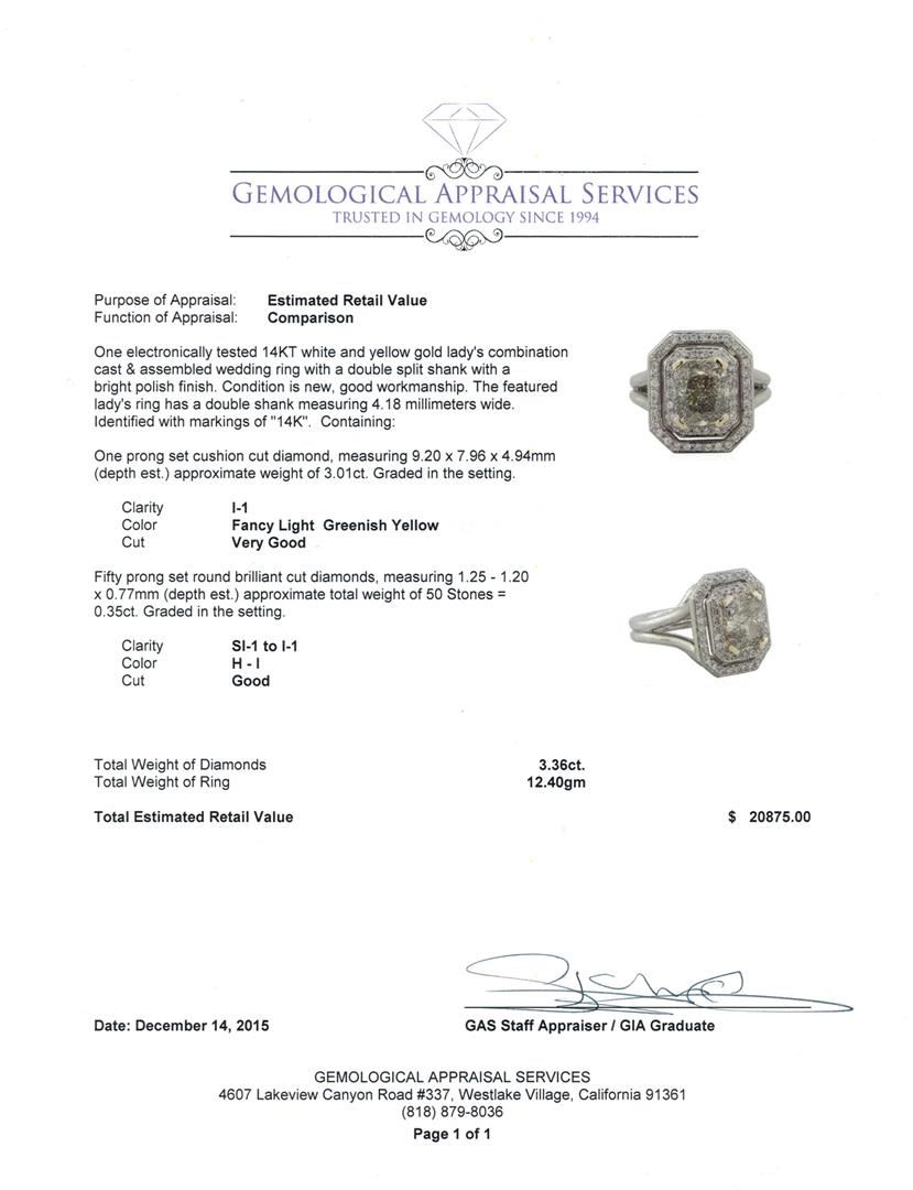 One electronically tested 14KT white and yellow gold lady's combination cast & assembled wedding ring with a double split shank with a bright polish finish. The featured lady's ring has a double shank measuring 4.18 millimeters wide. Identified with markings of "14K". Condition is new, good workmanship. Containing: One prong set cushion cut diamond, measuring 9.20 x 7.96 x 4.94mm (depth est.) approximate weight of 3.01ct. Graded in the setting. Clarity: I-1 Cut Very Good Fifty prong set round brilliant cut diamonds, measuring 1.25 - 1.20 x 0.77mm (depth est.) approximate total weight of 50 Stones = 0.35ct. Graded in the setting. Clarity: SI-1 to I-1. Color: H - I. Cut Good. Total Weight of Diamonds 3.36ct. Total Weight of Ring 12.40gm. GAS Appraised at $20,875.00.