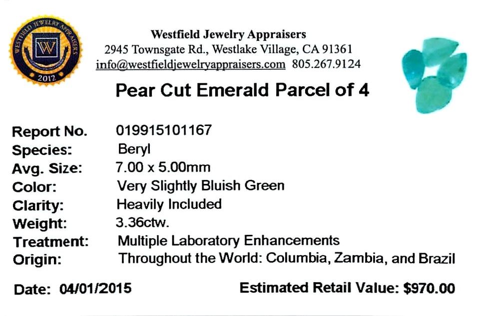 One 3.36 ctw Pear Mixed Emerald Parcel.