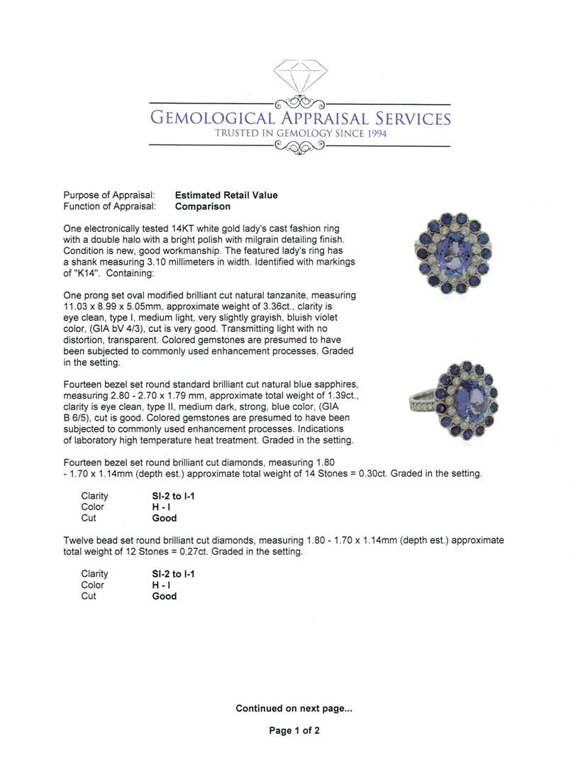 One electronically tested 14KT white gold lady's cast fashion ring with a double halo with a bright polish with milgrain detailing finish. The featured lady's ring has a shank measuring 3.10 millimeters in width. Identified with markings of "K14". Condition is new, good workmanship. Containing: One prong set oval modified brilliant cut natural tanzanite, measuring 11.03 x 8.99 x 5.05mm, approximate weight of 3.36ct., clarity is eye clean, type I, medium light, very slightly grayish, bluish violet color, (GIA bV 4/3), cut is very good. Transmitting light with no distortion, transparent. Colored gemstones are presumed to have been subjected to commonly used enhancement processes. Graded in the setting. Fourteen bezel set round standard brilliant cut natural blue sapphires, measuring 2.80 - 2.70 x 1.79 mm, approximate total weight of 1.39ct., clarity is eye clean, type II, medium dark, strong, blue color, (GIA B 6/5), cut is good. Colored gemstones are presumed to have been subjected to commonly used enhancement processes. Indications of laboratory high temperature heat treatment. Graded in the setting. Fourteen bezel set round brilliant cut diamonds, measuring 1.80 - 1.70 x 1.14mm (depth est.) approximate total weight of 14 Stones = 0.30ct. Graded in the setting. Clarity: SI-2 to I-1. Color: H - I. Cut Good Twelve bead set round brilliant cut diamonds, measuring 1.80 - 1.70 x 1.14mm (depth est.) approximate total weight of 12 Stones = 0.27ct. Graded in the setting. Clarity: SI-2 to I-1. Color: H - I. Cut Good. Total Weight of Colored Stones 4.75ct. Total Weight of Diamonds 0.57ct. Total Weight of Ring 9.10gm. GAS Appraised at $6,930.00.