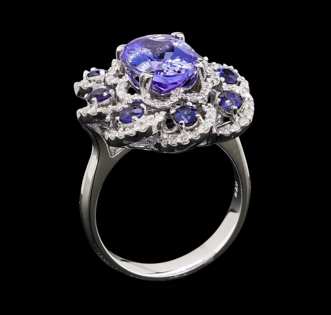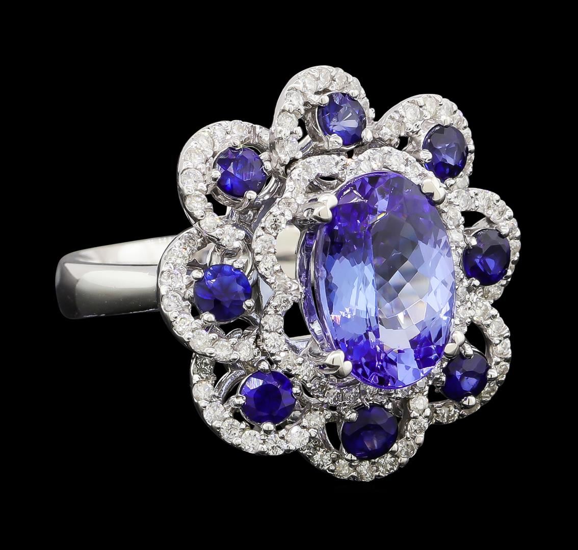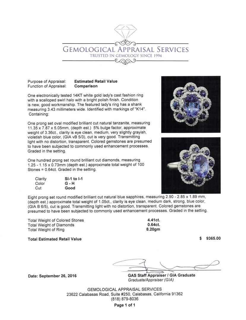 One electronically tested 14KT white gold lady's cast fashion ring with a scalloped swirl halo with a bright polish finish. The featured lady's ring has a shank measuring 3.43 millimeters wide. Identified with markings of 'K14'. Condition is new, good workmanship. Containing: One prong set oval modified brilliant cut natural tanzanite, measuring 11.35 x 7.87 x 5.05mm, (depth est.) 5%. bulge factor, approximate weight of 3.36ct., clarity is eye clean, medium, very slightly grayish, violetish blue color, (GIA vB 5/3), cut is very good. Transmitting light with no distortion, transparent. Colored gemstones are presumed to have been subjected to commonly used enhancement processes. Graded in the setting. One Hundred prong set round brilliant cut diamonds, measuring 1.25 - 1.15 x 0.73mm (depth est.) approximate total weight of 100 Stones = 0.64ct. Graded in the setting. Clarity SI-1 to I-1. Color: G - H Cut Good Eight prong set round modified brilliant cut natural blue sapphires, measuring 2.90 - 2.85 x 1.89 mm, (depth est.) approximate total weight of 1.05ct., clarity is eye clean, medium dark, strong, blue color, (GIA B 6/5), cut is good. Transmitting light with no distortion, transparent. Colored gemstones are presumed to have been subjected to commonly used enhancement processes. Graded in the setting. Total Weight of Colored Stones 4.41ct.. Total Weight of Diamonds 0.64ct.. Total Weight of Ring 8.20gm. GAS Appraised at $9,365.00.