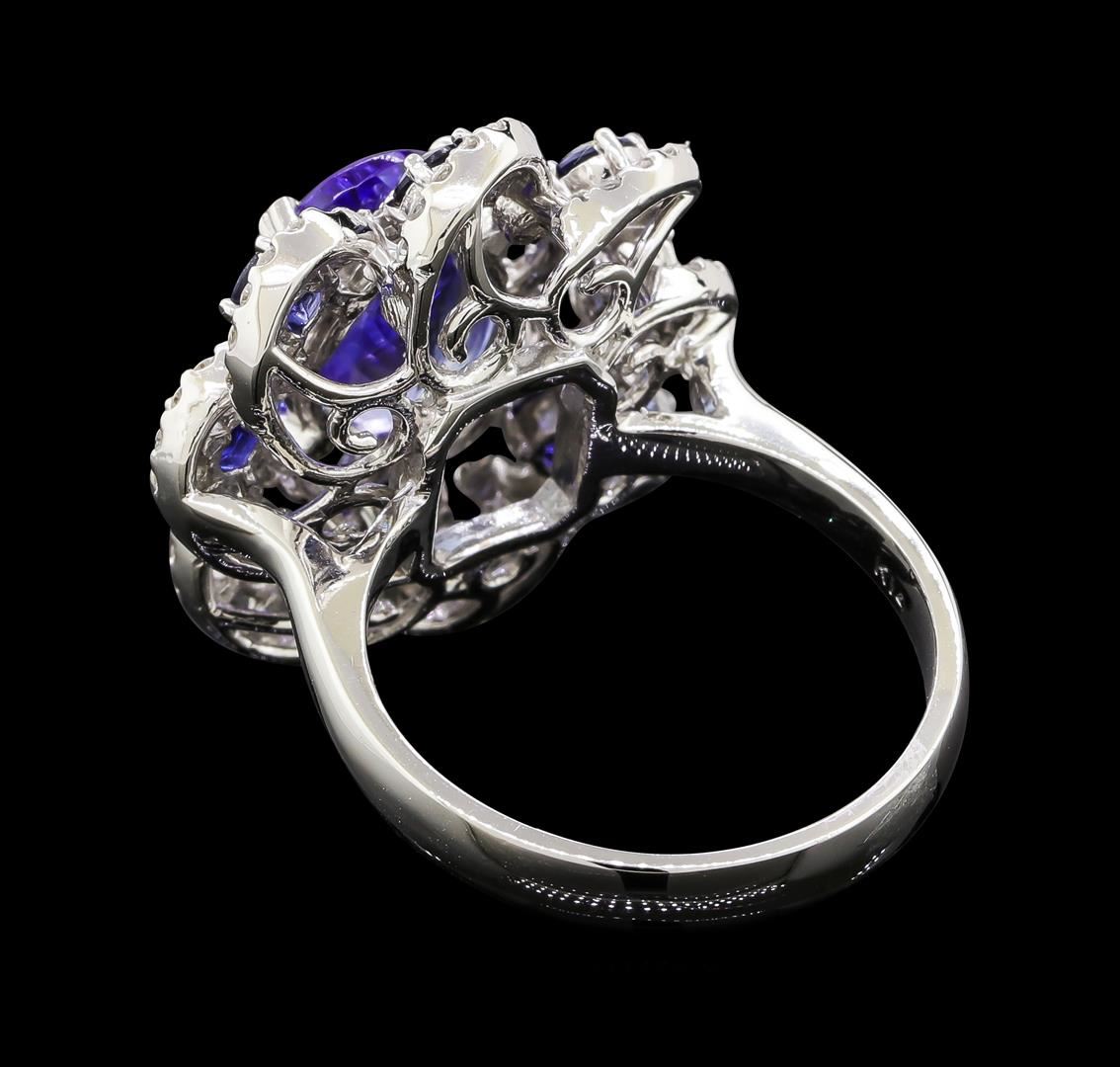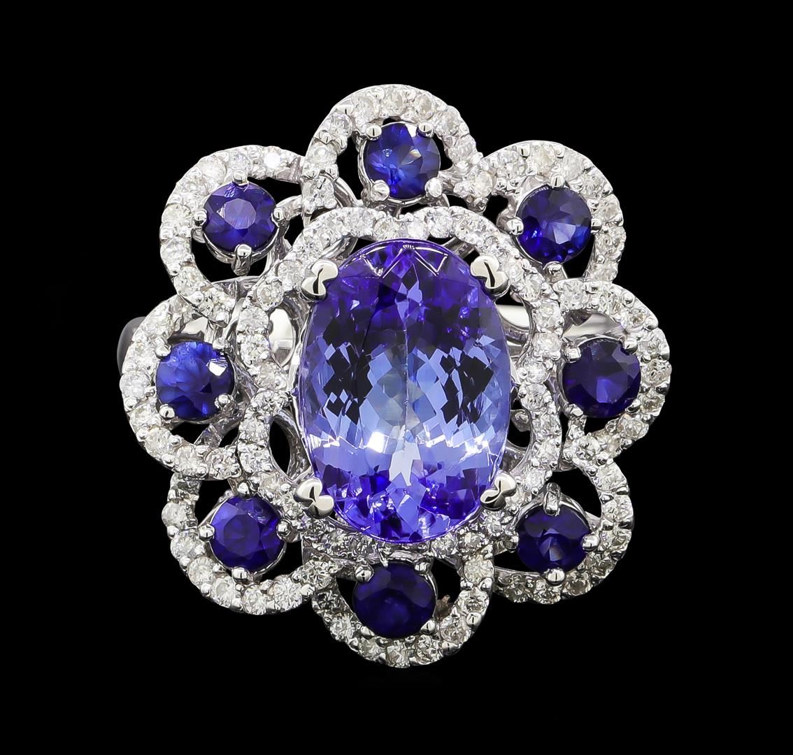 One electronically tested 14KT white gold lady's cast fashion ring with a scalloped swirl halo with a bright polish finish. The featured lady's ring has a shank measuring 3.43 millimeters wide. Identified with markings of 'K14'. Condition is new, good workmanship. Containing: One prong set oval modified brilliant cut natural tanzanite, measuring 11.35 x 7.87 x 5.05mm, (depth est.) 5%. bulge factor, approximate weight of 3.36ct., clarity is eye clean, medium, very slightly grayish, violetish blue color, (GIA vB 5/3), cut is very good. Transmitting light with no distortion, transparent. Colored gemstones are presumed to have been subjected to commonly used enhancement processes. Graded in the setting. One Hundred prong set round brilliant cut diamonds, measuring 1.25 - 1.15 x 0.73mm (depth est.) approximate total weight of 100 Stones = 0.64ct. Graded in the setting. Clarity SI-1 to I-1. Color: G - H Cut Good Eight prong set round modified brilliant cut natural blue sapphires, measuring 2.90 - 2.85 x 1.89 mm, (depth est.) approximate total weight of 1.05ct., clarity is eye clean, medium dark, strong, blue color, (GIA B 6/5), cut is good. Transmitting light with no distortion, transparent. Colored gemstones are presumed to have been subjected to commonly used enhancement processes. Graded in the setting. Total Weight of Colored Stones 4.41ct.. Total Weight of Diamonds 0.64ct.. Total Weight of Ring 8.20gm. GAS Appraised at $9,365.00.