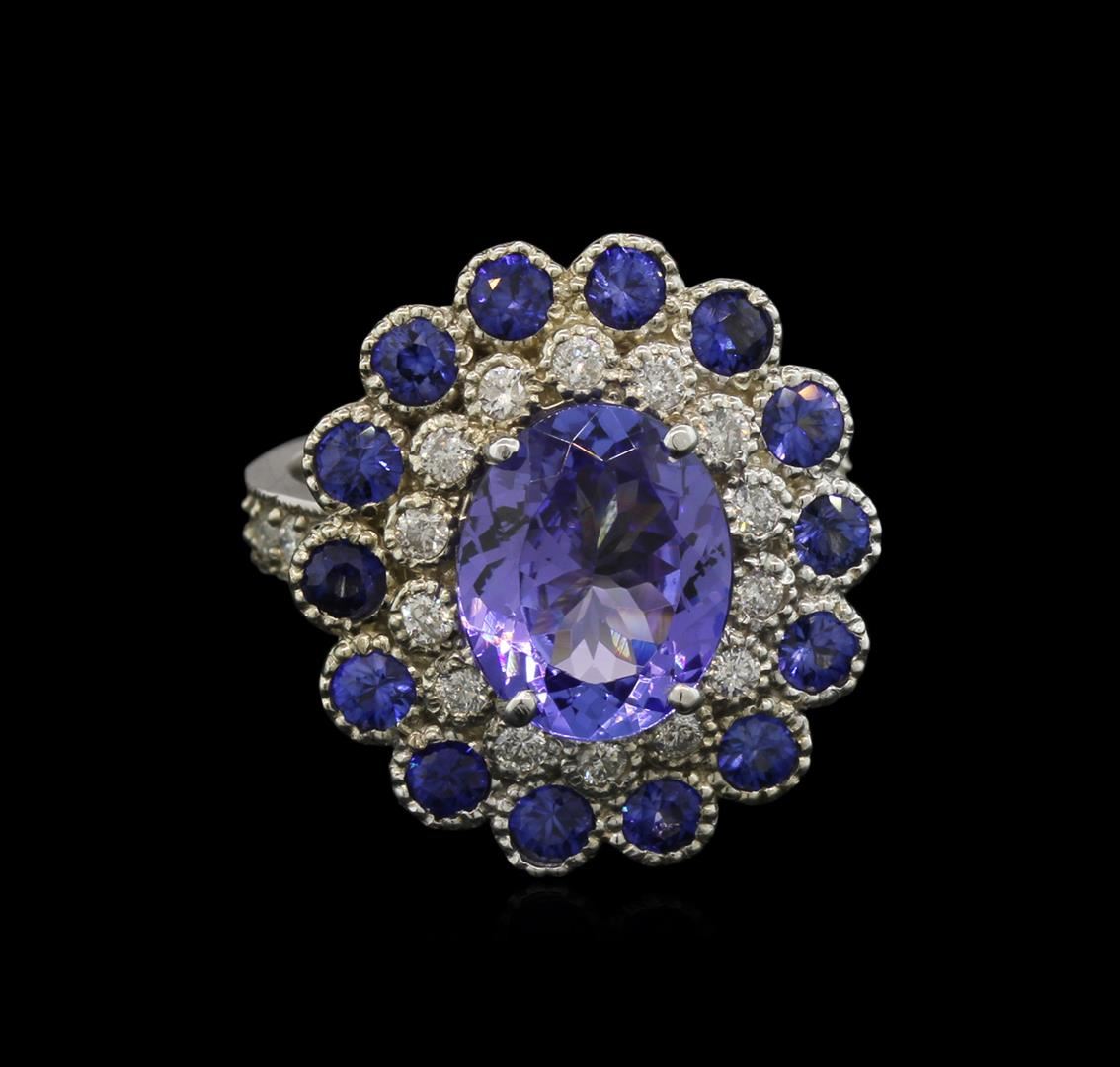 One electronically tested 14KT white gold lady's cast fashion ring with a double halo with a bright polish with milgrain detailing finish. The featured lady's ring has a shank measuring 3.10 millimeters in width. Identified with markings of "K14". Condition is new, good workmanship. Containing: One prong set oval modified brilliant cut natural tanzanite, measuring 11.03 x 8.99 x 5.05mm, approximate weight of 3.36ct., clarity is eye clean, type I, medium light, very slightly grayish, bluish violet color, (GIA bV 4/3), cut is very good. Transmitting light with no distortion, transparent. Colored gemstones are presumed to have been subjected to commonly used enhancement processes. Graded in the setting. Fourteen bezel set round standard brilliant cut natural blue sapphires, measuring 2.80 - 2.70 x 1.79 mm, approximate total weight of 1.39ct., clarity is eye clean, type II, medium dark, strong, blue color, (GIA B 6/5), cut is good. Colored gemstones are presumed to have been subjected to commonly used enhancement processes. Indications of laboratory high temperature heat treatment. Graded in the setting. Fourteen bezel set round brilliant cut diamonds, measuring 1.80 - 1.70 x 1.14mm (depth est.) approximate total weight of 14 Stones = 0.30ct. Graded in the setting. Clarity: SI-2 to I-1. Color: H - I. Cut Good Twelve bead set round brilliant cut diamonds, measuring 1.80 - 1.70 x 1.14mm (depth est.) approximate total weight of 12 Stones = 0.27ct. Graded in the setting. Clarity: SI-2 to I-1. Color: H - I. Cut Good. Total Weight of Colored Stones 4.75ct. Total Weight of Diamonds 0.57ct. Total Weight of Ring 9.10gm. GAS Appraised at $6,930.00.