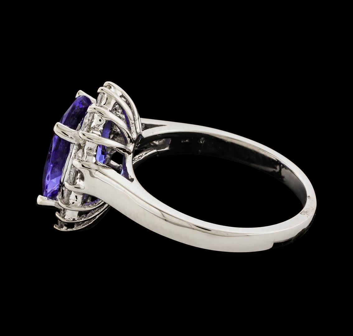 One electronically tested 14KT white gold lady's cast fashion ring with a basket halo with a bright polish finish. The featured lady's ring has a shank measuring 1.95 millimeters wide. Identified with markings of '14K'. Condition is new, good workmanship. Containing: One prong set pear modified brilliant cut natural tanzanite, measuring 12.35 x 8.95 x 5.15mm, (depth est.) approximate weight of 3.36ct., clarity is eye clean, medium, moderately strong, bluish violet color, (GIA bV 5/4), cut is good. Transmitting light with no distortion, transparent. Colored gemstones are presumed to have been subjected to commonly used enhancement processes. Graded in the setting. Sixteen prong set round brilliant cut diamonds, measuring 2.20 - 2.10 x 1.29mm (depth est.) approximate total weight of 16 Stones = 0.58ct. Graded in the setting. Clarity SI-1 to SI-2. Color: G - H Cut Good. Total Weight of Colored Stones 3.36ct.. Total Weight of Diamonds 0.58ct.. Total Weight of Ring 5.10gm GAS Appraised at $6,875.00.