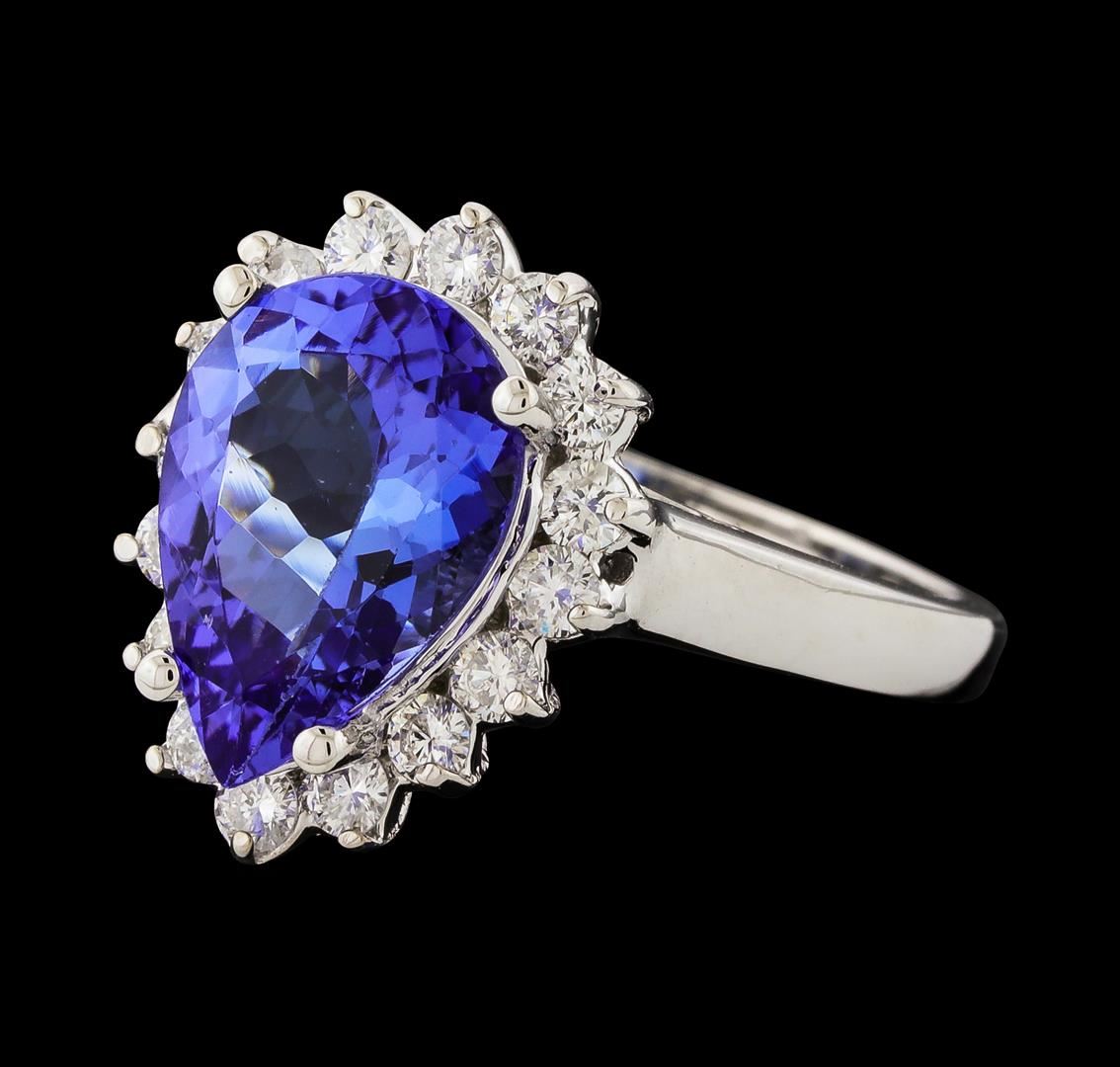 One electronically tested 14KT white gold lady's cast fashion ring with a basket halo with a bright polish finish. The featured lady's ring has a shank measuring 1.95 millimeters wide. Identified with markings of '14K'. Condition is new, good workmanship. Containing: One prong set pear modified brilliant cut natural tanzanite, measuring 12.35 x 8.95 x 5.15mm, (depth est.) approximate weight of 3.36ct., clarity is eye clean, medium, moderately strong, bluish violet color, (GIA bV 5/4), cut is good. Transmitting light with no distortion, transparent. Colored gemstones are presumed to have been subjected to commonly used enhancement processes. Graded in the setting. Sixteen prong set round brilliant cut diamonds, measuring 2.20 - 2.10 x 1.29mm (depth est.) approximate total weight of 16 Stones = 0.58ct. Graded in the setting. Clarity SI-1 to SI-2. Color: G - H Cut Good. Total Weight of Colored Stones 3.36ct.. Total Weight of Diamonds 0.58ct.. Total Weight of Ring 5.10gm GAS Appraised at $6,875.00.