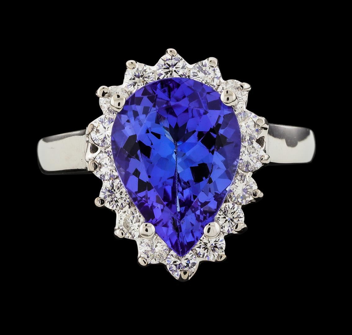 One electronically tested 14KT white gold lady's cast fashion ring with a basket halo with a bright polish finish. The featured lady's ring has a shank measuring 1.95 millimeters wide. Identified with markings of '14K'. Condition is new, good workmanship. Containing: One prong set pear modified brilliant cut natural tanzanite, measuring 12.35 x 8.95 x 5.15mm, (depth est.) approximate weight of 3.36ct., clarity is eye clean, medium, moderately strong, bluish violet color, (GIA bV 5/4), cut is good. Transmitting light with no distortion, transparent. Colored gemstones are presumed to have been subjected to commonly used enhancement processes. Graded in the setting. Sixteen prong set round brilliant cut diamonds, measuring 2.20 - 2.10 x 1.29mm (depth est.) approximate total weight of 16 Stones = 0.58ct. Graded in the setting. Clarity SI-1 to SI-2. Color: G - H Cut Good. Total Weight of Colored Stones 3.36ct.. Total Weight of Diamonds 0.58ct.. Total Weight of Ring 5.10gm GAS Appraised at $6,875.00.